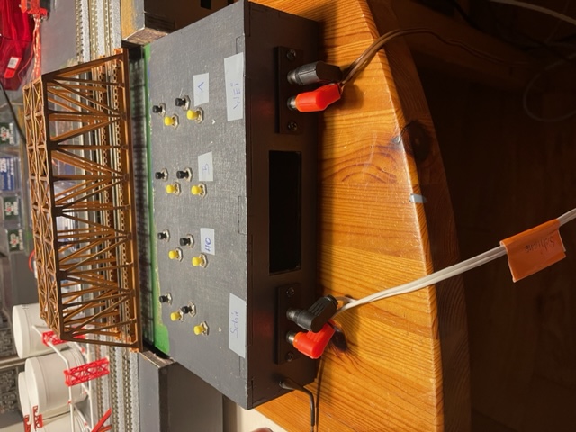 meine Anlage mal von oben noch ohne Schaltpult und nun noch einmal mit meinem Einschub mit Schalter für die Weichen, geplant sind "weitere ??!! " Weichen. Im Einschub sind 2 x Weichenschaltmodule , von hier aus gehen je ein Kabel raus zu den 3 Weichen. Links das Triple und dann rechts die großen Kurvenmodule.