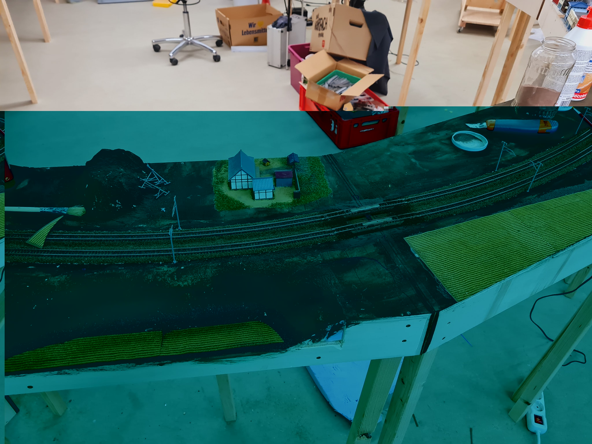Heute gings an die Bahnhofsgleise welche ich passen zu den neuen geschotterten Modulen farblich behandel habe. Das ganze sieht jetzt wirklich viel gefälliger aus. Das Flussbett ist auch vorbereitet für das Gießharz (das kommt aber erst in den nächsten Wochen drann).