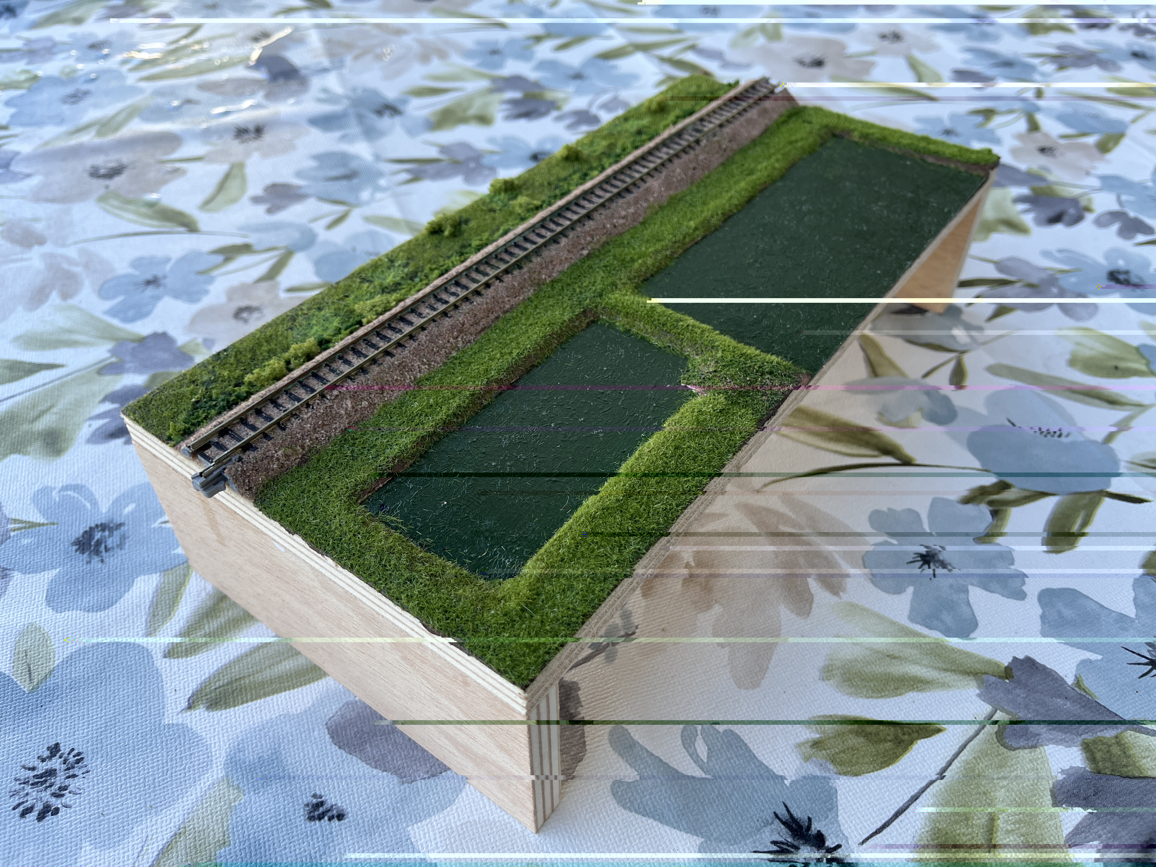 Nachdem die Gleise verlegt waren, kamen die Bahnsteige, die Fußgängerbrücke, und das Stationsgebäude dran. Und weil ich so im flow war, gings gleich ans mit Gebäuden vervollständigen, und begrünen: Weitere Fortschritte folgen