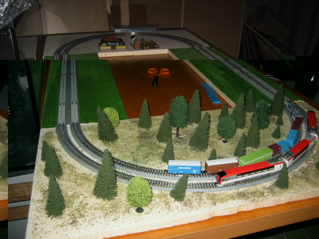 Die 180° Kurve hab eich heute dekoriert, ich habe in Stuttgart eine Schachtel günstige Bäume un ein bischen Streumaterial gekauft. Leider hatte ich den Schotter vergessen. Nun muss ich den Gleiszwischenraum später Schottern.