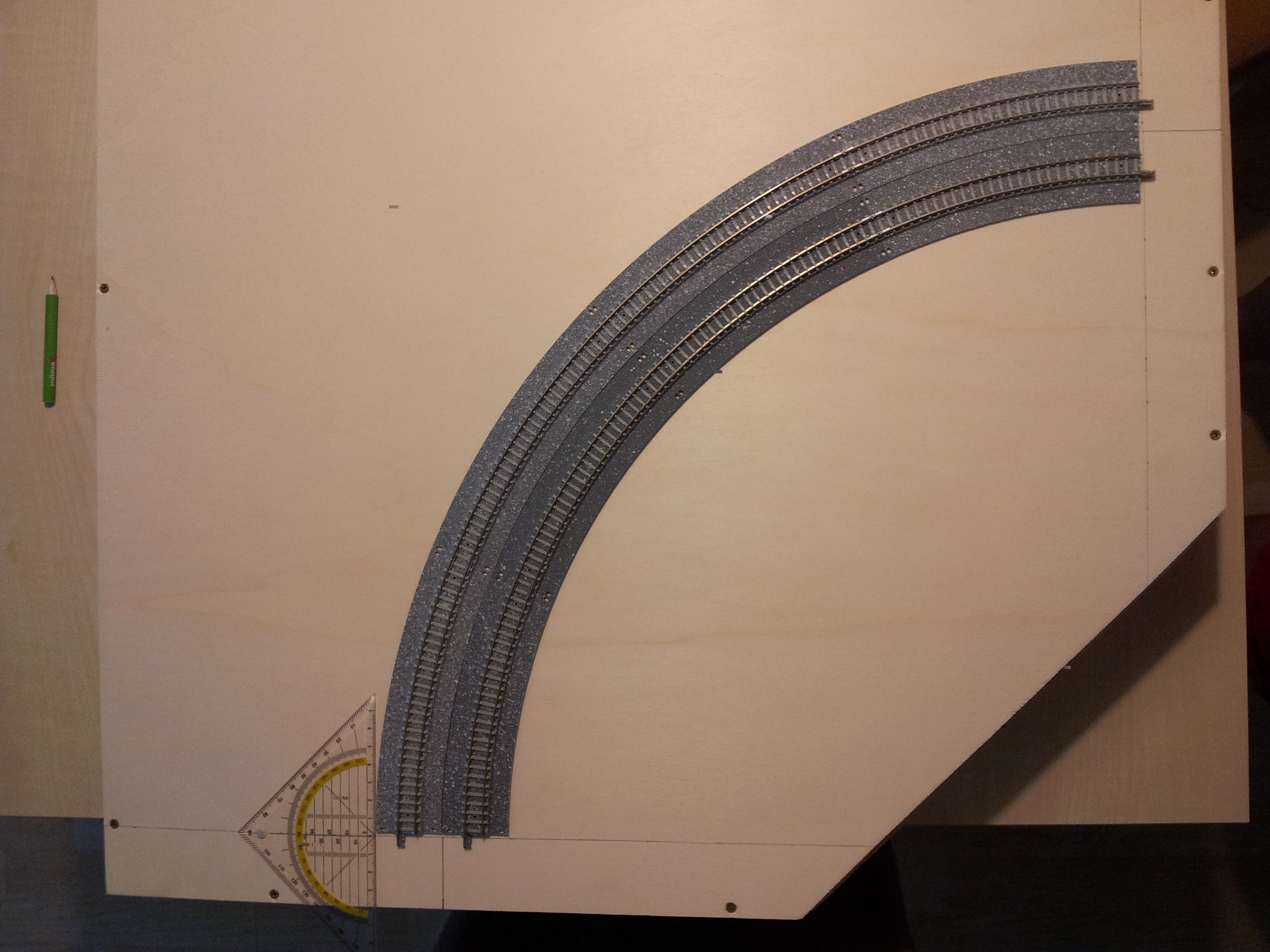 also Formtechnisch bzw. größentechnisch haben wir uns auf das stanartmaß 60/120cm länge und 40cm breite geeinigt. Die Eckmodule haben mit dei großen standart radien , also 354 und 391 - wenn du jetzt ein langezogenes Kurventeil bauen möchtes, solltest du also schauen das du irgendwie im Raster bleibst, daher mein Vorschlag: nimm die Maße vom Eckmodul, setzte jeweils an beiden enden noch ein 30cm Modul an (wären dann gesamtaußenmaße 91cm x 91cm) und schau das du für die gegenüberliegenden Seiten vom Modullayout gesamt ggf. noch 2 x 30cm module bastelst (anbei eine Skizze wie ich das meine), es bleibt aber noch Transportabel