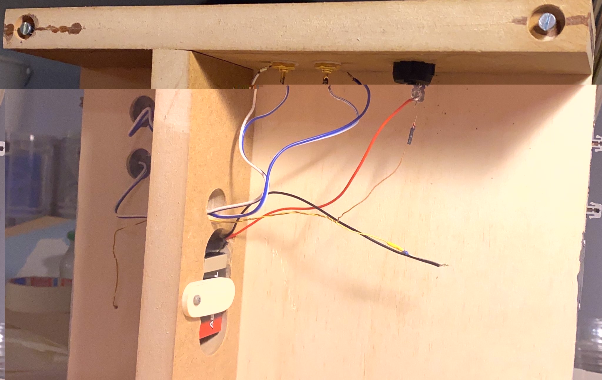 Um die Unabhängigkeit der Module zu gewährleisten, bekommt für die Beleuchtung jedes Modul eine eigene Stromversorgung mit einem 9V-Block. Außerdem soll das Licht schaltbar sein. (Die Cinch-Buchsen links sind der Gleissstromanschluss.)
