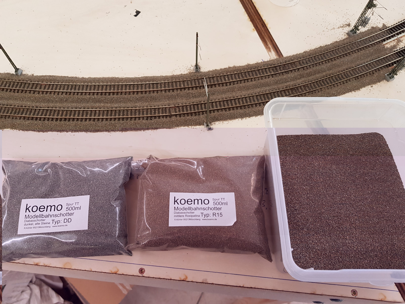 Der auf dem 1. Bild ist TT (ist auch meine TT Anlage dort), also in N dann den N Schotter nehmen, die passen halt von der Körnung her und sind auch keine runden Steine sondern kantige, wie beim Vorbild. Dort sind wie auf der Seite 2 Schotterfarben 1:1 gemischt (und glaub mir, das reicht für deine Anlage dicke jeweils ein so ein 500ml Beutel ;) ). Hier sieht man das aber da sind die Farben aufgrund der alten Handykamera nicht so gut zu sehen gewesen (daher das Bild vorher).