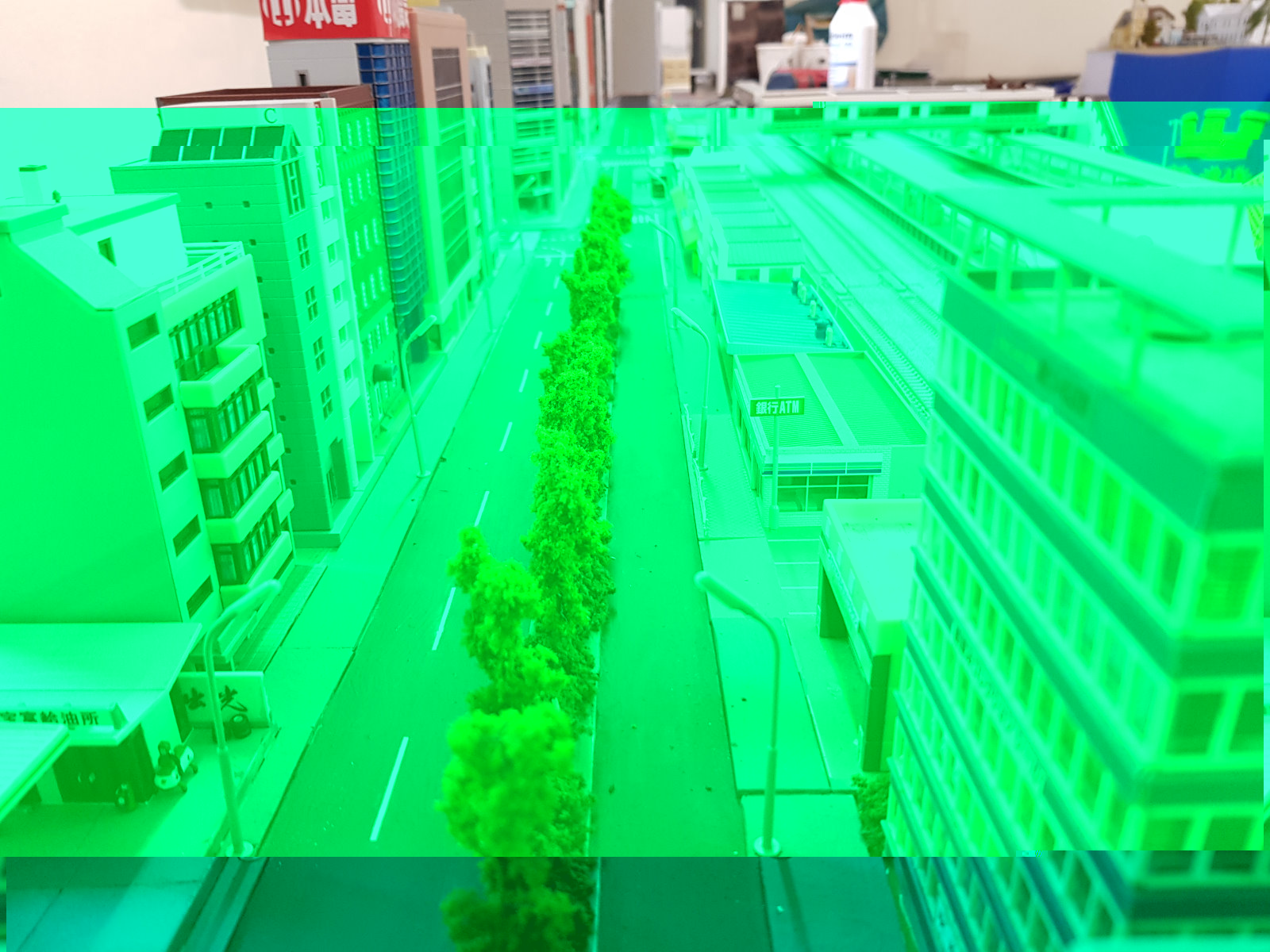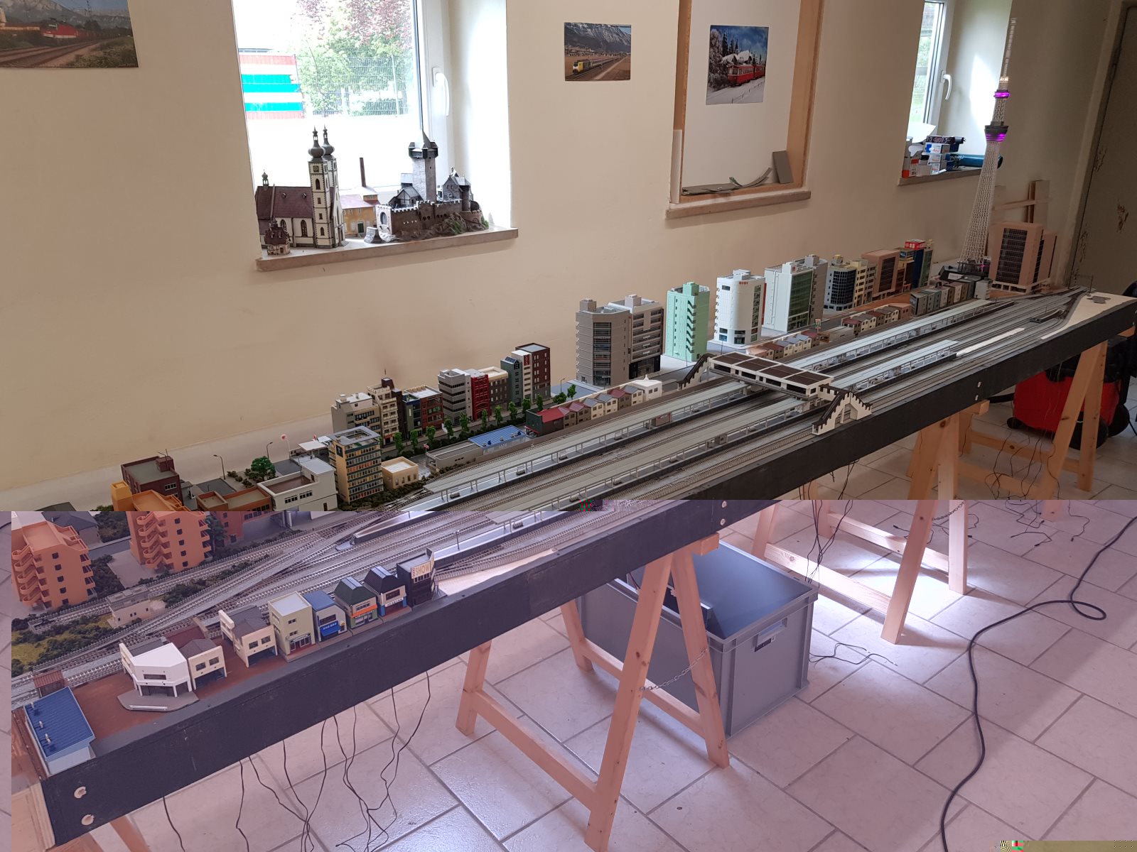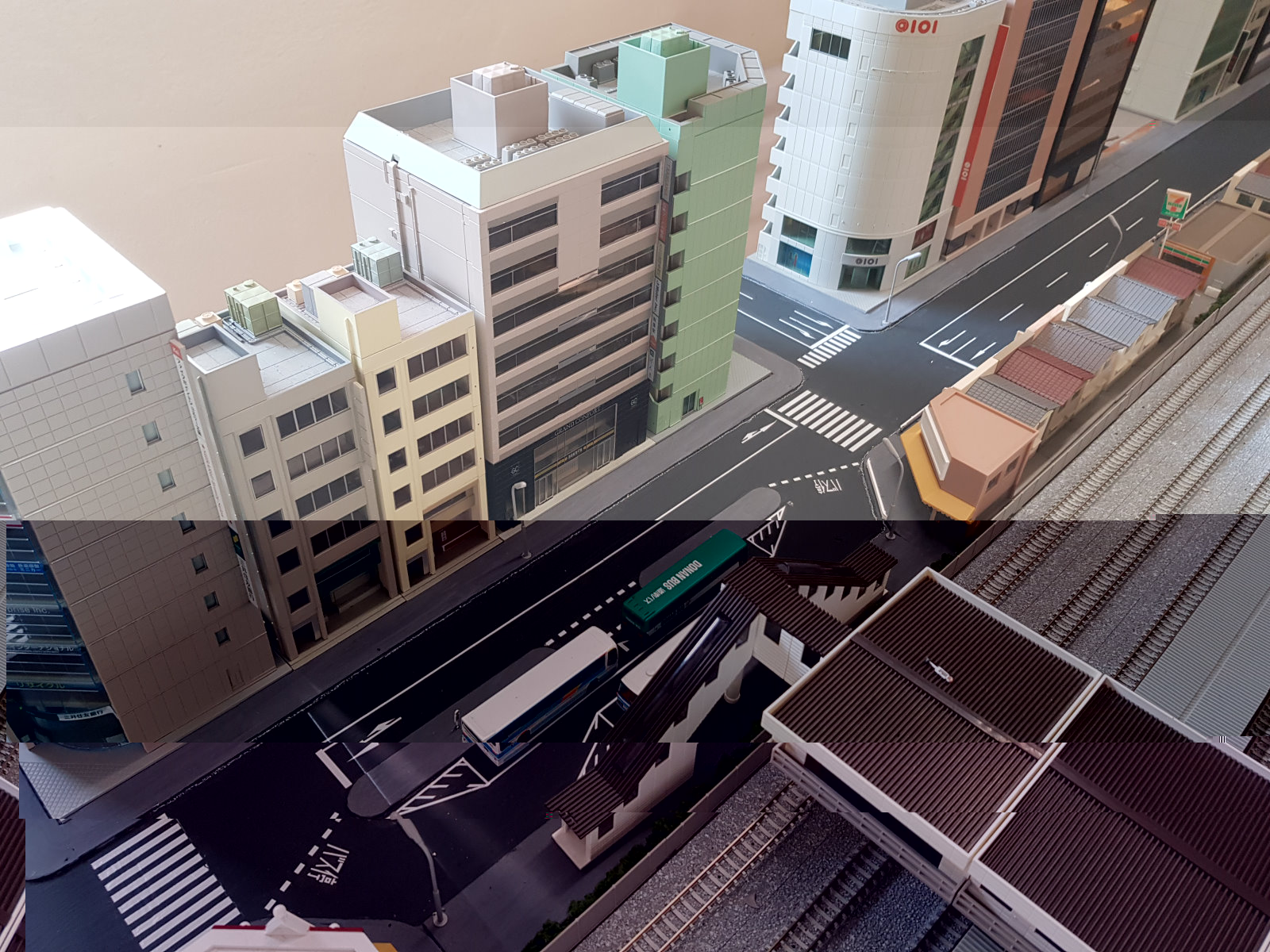am Bahnhof selber habe ich nun die Gleiszwischenräume wieder gefüllt. Dafür bekam die Stadtzeile einen Umbau. Durch das abreißen des 50er Stadtmoduls hatte ich jetzt wieder die 3er-shops von Tomix frei, also habe ich die gleich hergenommen um die ganzen Shops am Bahnhofs weiter zu führen. Gegenüber wurde der Hochhausblock auch erweitert (gut jetzt fehlen noch 2 Kato Häuser die ordere ich aber die Tage nach). Der Sky Tree bekommt jetzt einen Fest Platz am ende der Bahnhofsstraße. Die noch freien Ecken auf der anderen Bahnhofsseite werden mit Shops und Wohnhäuser bebaut. Die Tage bastel ich wieder Gehwege aus Trittschalldämmung und dann sollte sich das Straßenbild schon verbessert haben.