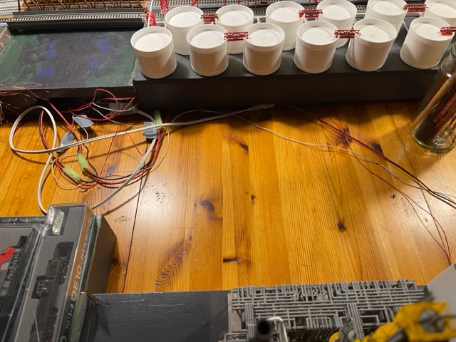 Bei mir habe ich die Schwierigkeit Fahrstromkabel plus eine 2.Einspeisung, eine Reihe ( 10x ) Peitschen-Lampen je Triple und die Weichen-Kabel unter zu bringen.Die Schaltknöpfe für die Weichen habe ich auf einem Extra-Modul nur 6cm hoch unter 3 Brücken untergeschoben. Oben drauf eine Wasserfläche gelegt. So kommen halt einige Kabel zusammen, die ja getrennt gespeist werden.