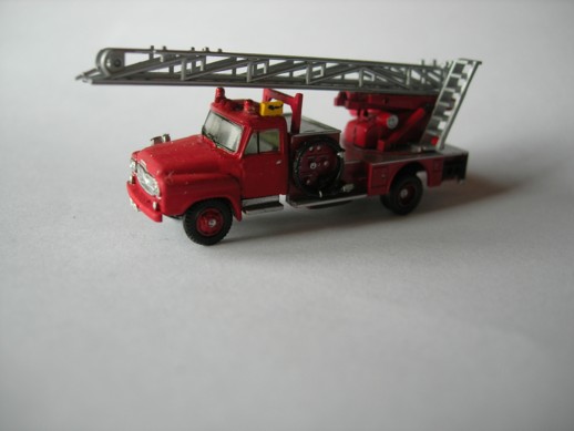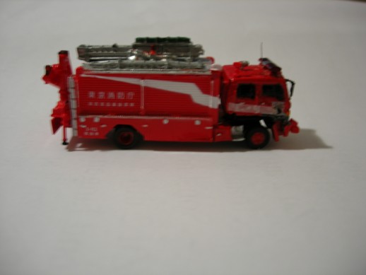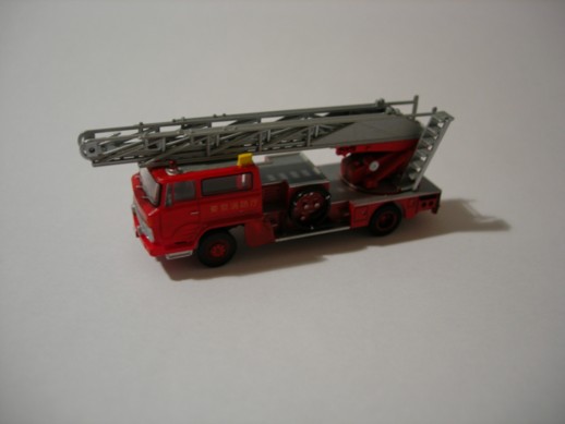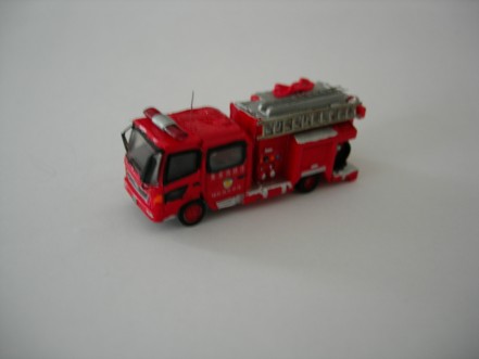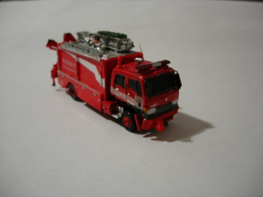 Hino Engine der A-One Fire Unit Tokyo. Die Kabine und Räder sind von Bandai. Der Aufbau ist von einem Lawson Modell der komplett umgebaut wurde. Ebenfalls von Lawson ist der Rotlichtbalken.Leiter ist von GHQ