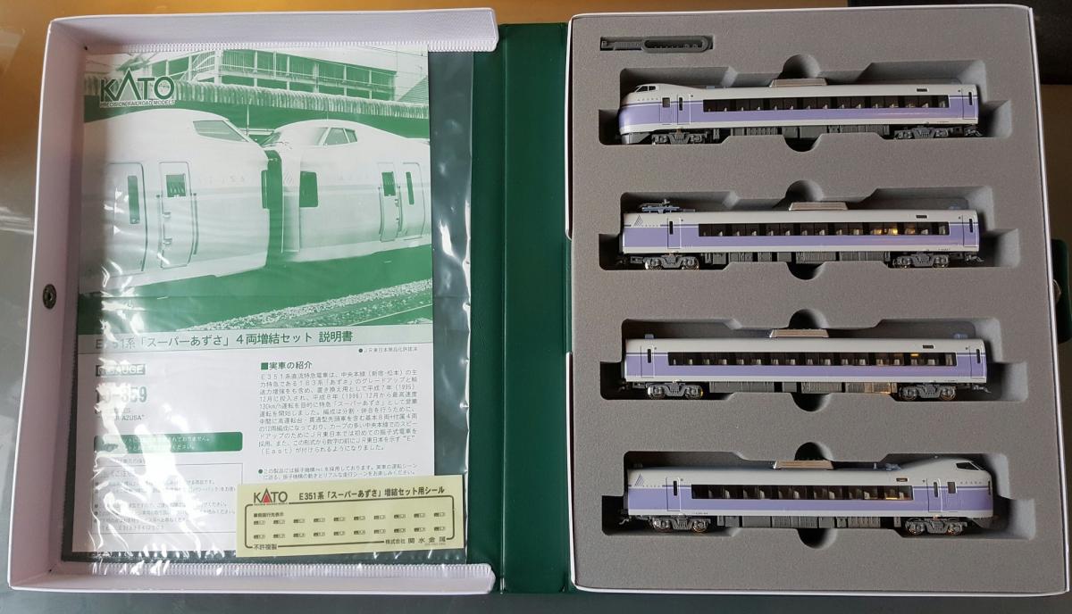 Kato JR E351 Super Azusa Ergänzungsset Ein echter Glücksgriff. Zufällig bei HS gefunden und sofort ugeschlagen. Eigentlich ist das Set ja schon lange ausverkauft. Sogar die Preise auf dem japanischen Gebrauchtmarkt sind ordentlich gesalzen.