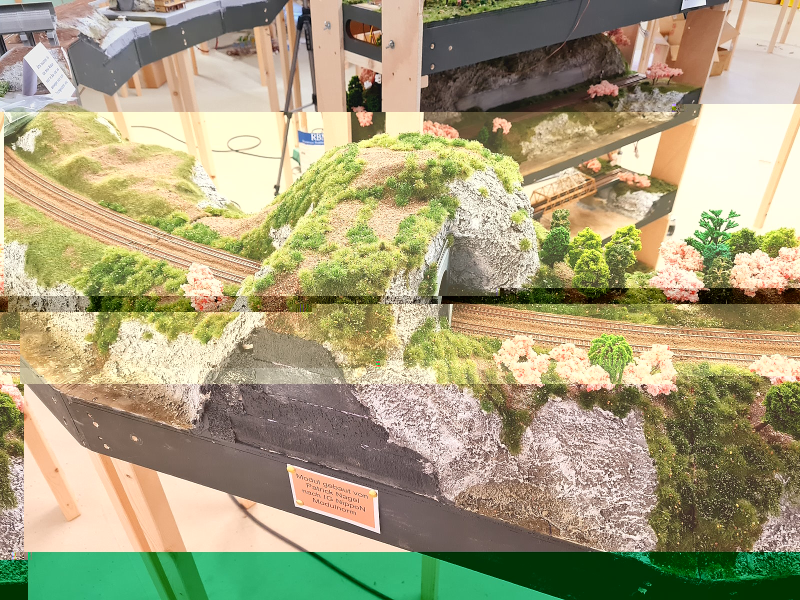 Tja, warum hab ich so gas gegeben, ich sollte beim Sommerfest von Modellbahn Pürner anfang Juli (2. Juli) mit meinen Japanmodulen Ausstellen und da wollte ich dann doch noch ein wenig mehr Gestaltung haben. Das ganze habe ich für die IG-Nippon als Werbung genutzt also mit Banner