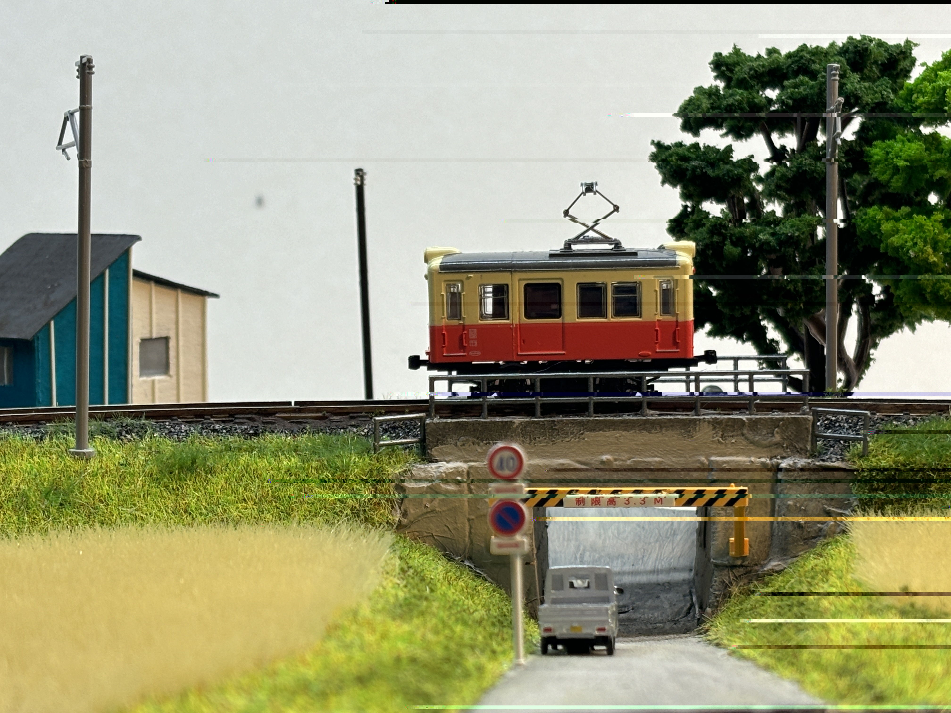 Zur Stromversorgung der Minimodule habe ich in das Gleisbett eines beliebigen Kato-Gleises jeweils direkt unter der Schiene ein 2mm-Loch gebort, dort die Kabel durchgeführt und von unten an die Schienen gelötet. (Zum Löten habe ich Schienen und Gleisbett getrennt.) So ist man unabhängig von der Kato-Einspeisung.