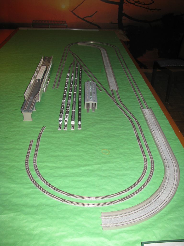 Hier die Totale. Was Fehlt noch? 4 Weichen, ein paar Doppelkurven und die dazu passenden Rampen, sowie etwas normales Gleis. Und der Bahnhof muss noch doppelt.