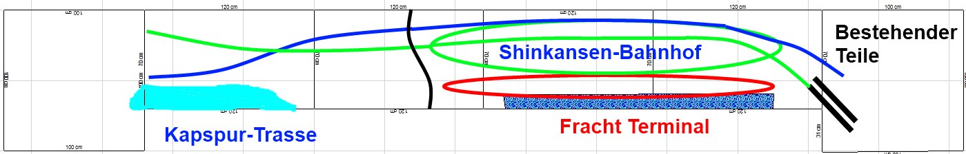 also wie der Titel schon verrät sitzt ich zurzeit an planungen für Little Tokio und dessen erweiterung am Linken teil (geplannt sind jetzt 3-4 Segmente a 70 x 120cm und wieder ein Eck-Segment. Angedacht als Themen zur verwirklichungen sind ja zum einen ein Shinkansen-Bahnhof (4 gleisig zum überholen), ein Freight Terminal in Hafen-Nähe (bzw direkt am Becken ggf, also zur Betrachterseite hin ist der anlagenteil abgesenkt für ein kleines Hafenbecken), bisschen Strecke und am Eck-Teil dann viel wasser, Strand und ein kleinen Fischerdorf (insgesamt wären dafür 4,6m - 5,8m Platz). Ich habe jetzt mal angefangen zu Planen um mir genügend Denkanstöße geben zu können, zurzeit ist erstmal der Übergang zu machen, hier bin ich jetzt bei der Frage: Ich kommen vom Eckteil "City" rum auf das neue Segment, hier lass ich Links von der Hauptstrecke das kleine Terminal abgehen (3-4 Gleise zum be und entladen, maximal 180cm lang). Rechts daneben steht nun die Frage im raum ob ich die Shinkansen-Strecke wieder an der Rückwand langführe (für ein Bahnhof müsst ich dann ein Schlenker machen) oder ob ich mal die Kapspur-Haupstrecke nach hinten Verlagere und die durch Wälder, Berge etc Tarne um dann den Shinkansen Bahnhof schön mittig zwischen den gewonnen Platz zu setzten (wenn ich mein Rappel hab soll der lang genug für 16 teilige einheiten werden :roll: ). Ich habe das mal Grob geplant mit Variante 1, also vorne Fracht-Terminal dahinter Kapspur-Strecke und dahinter Shinkansen. Für Variante 1 müsste ich nur die geraden austauschen.