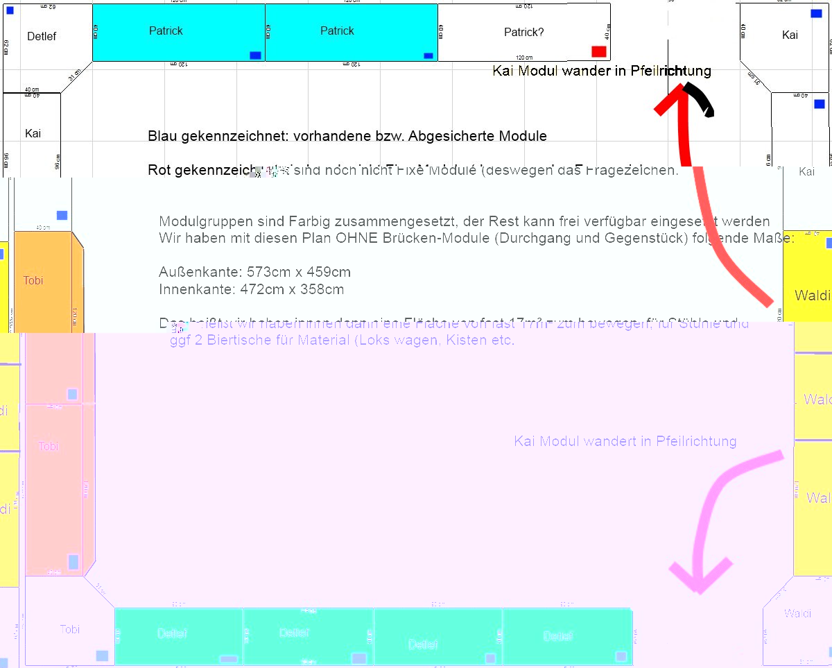 Also würdne uns innen um die 17m² zur verfügung stehen (steht im Plan auch nochmal alles drinne). Bitte gebt mir wie Tobi mal Schemaskizzen eurer Module (wegen dem Gleisverlauf), das ich diese in den Schemaplan nachtragen kann. Auf alle Fälle sollte wir schauen das wir die 2 Bahnhöfe so weit wie möglich auseinander haben das wir wirklich viel Fahrstrecke dazwischen haben.