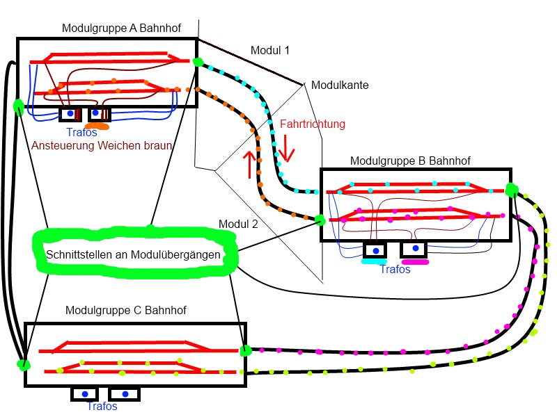 - Jedes Modul wird extra eingespeist über eine Ringleitung, diese Ringleitung ist an den Trafos angeklemmt. D.h. wir müssen eh zwischen den Trafos mindestens eine Unterbrechnung haben (trenngleise oder isolierverbinder).