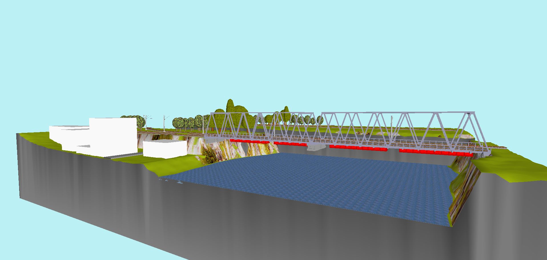 Modul 2 ist auch wieder ein gerades Streckenmodul - mit parrallel verlaufender Strecke (bei verwendung mit Modul oben kann man hier gut ein Zug zu schau stellen), bei einzel verwendung wird auch hier am Brückenende ein Prellbock auf das verrostete/überwucherte Gleis aufgesetzt. Landschaftlich überquert die Strecke ein kleines flussgebiet (sprich nicht so wässrig wie auf dem Plan und Bild, eher mehr Sand