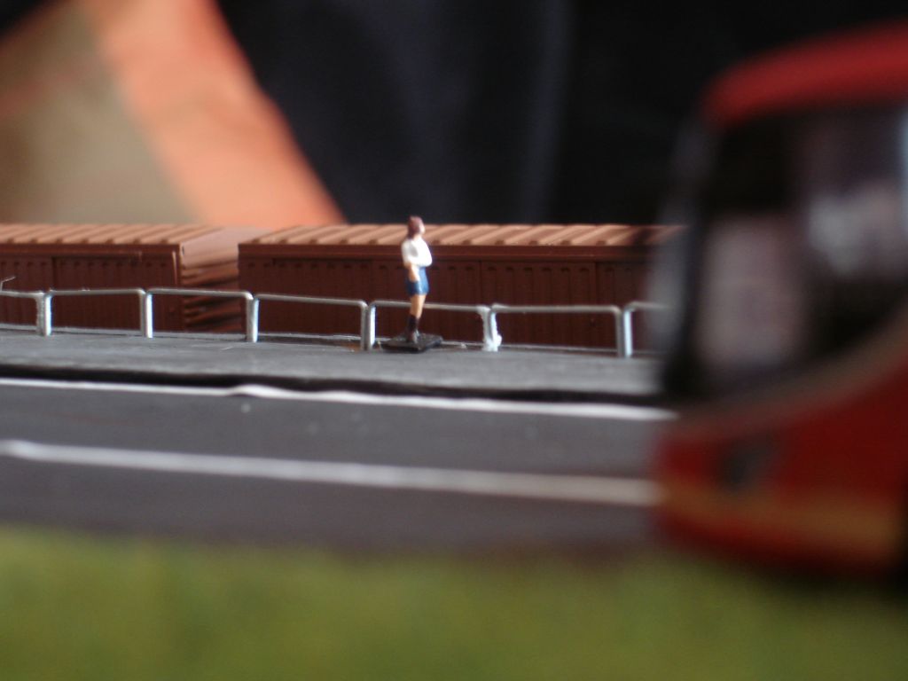 Die Erhöhung in der Front, sowie der Bürgersteig sind aus Pappe gemacht. Die Straße besteht auch aus einer dünnen Pappe, die mit Abtönfarben gestrichen wurde. Das Geländer stammen aus einem Tacker und wurden mt Sekundenkleber zusammen geklebt.