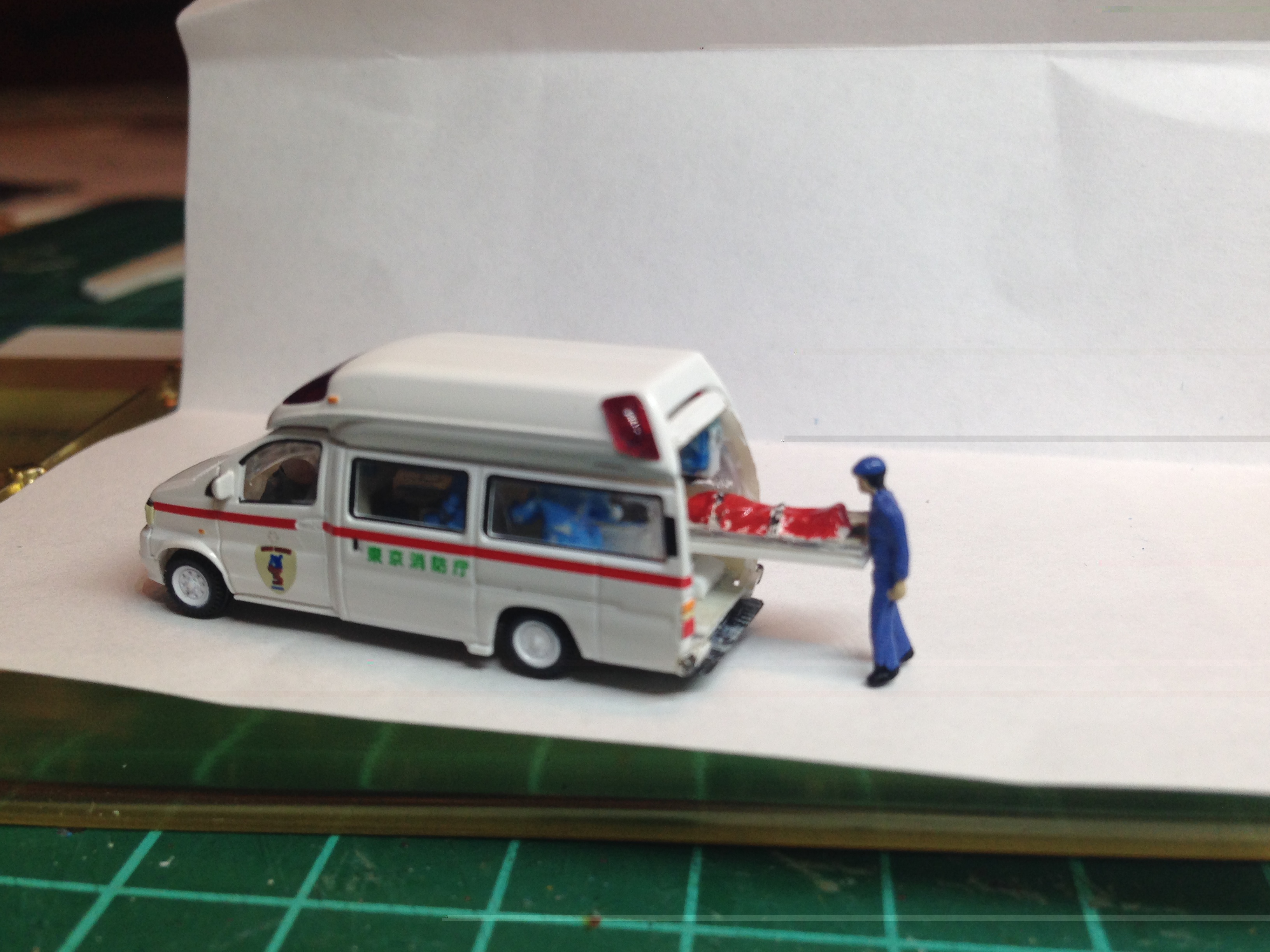 Bei dem rescue car lässt sich die Heckklappe öffnen und die Trage etwa auf 3/4 der Länge herausziehen. Soweit es ging habe ich die Inneneinrichtung Z.B. mit Sanitätern einschl. Fahrer und Beifahrer, Schränken, Sitzen, Tropf etc. nachgebildet. Sogar einen Stoßdämpfer (2 Kanülen mit unterschiedlichen Durchmessern) hat die Heckklappe.