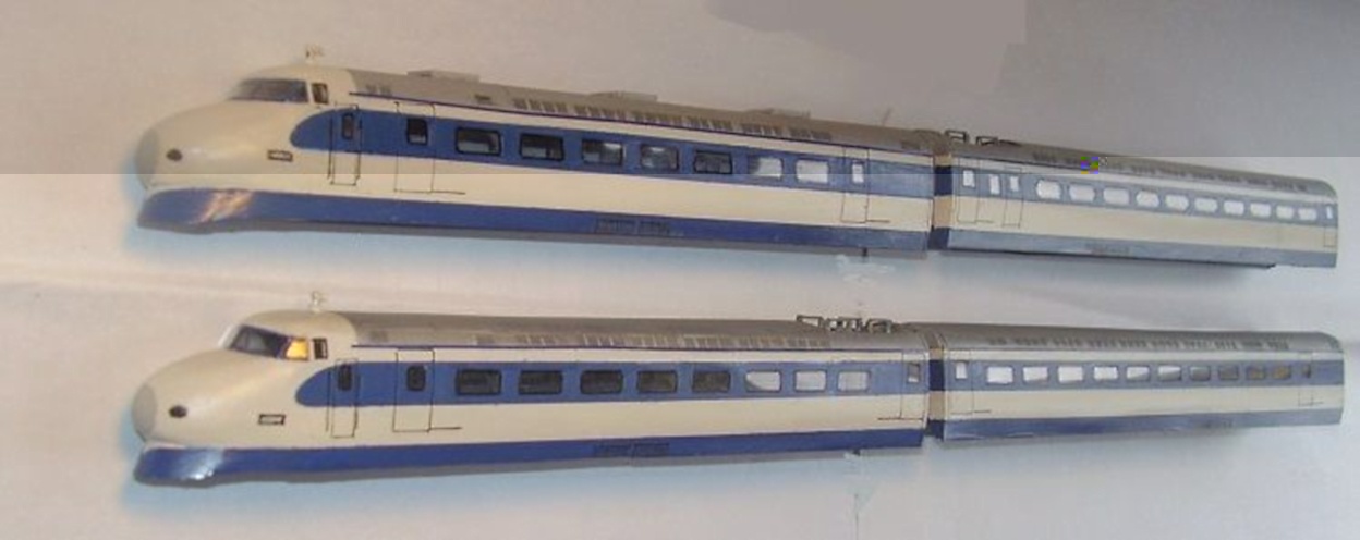 Dadurch das ich in meinen Japanischen Büchern einige Maßzeichnungen habe, konnte ich nun einen Shinkansen der 0-Serie als 4 teilier anfertigen lassen (die Chassis werden hier in Deutschland montiert ;) ). Dabei handelt es sich um den Zug B der 1000 Serie. Wie man sieht auch die Frontfenster sind unterschiedlich.