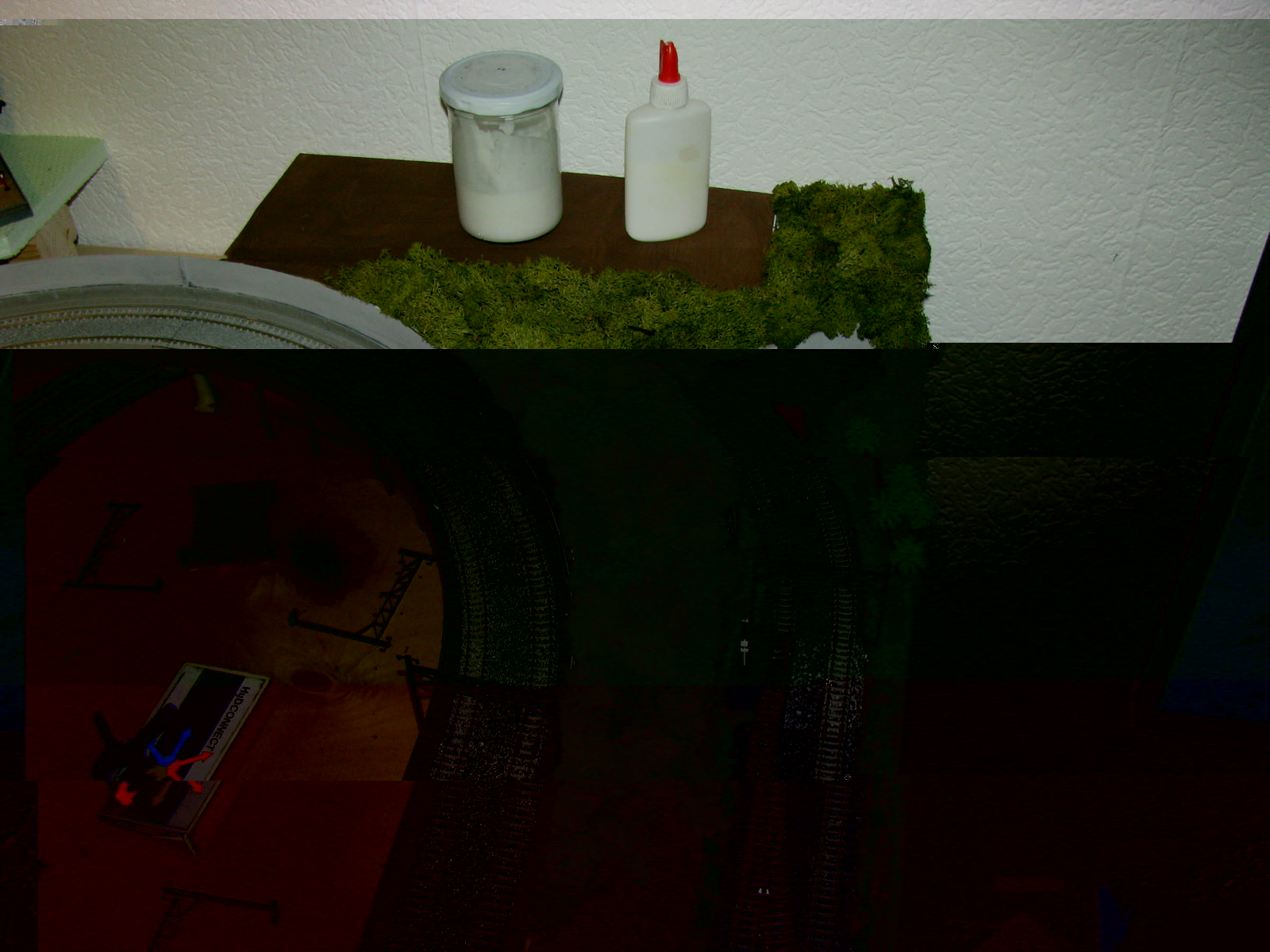 Unter der Hochtrasse soll eine Betonwand, wie auf meinen Mini Modulen, entstehen. Hinten hintergeht es mit dem Islandmoos weiter. Neben dem Eisenbahntunnel muss auch noch ein Auto-Tunnel hin. Sonst kommt man ja nicht in das Industriegebiet. Ob die Lokschuppen dort so bleiben steht noch nicht fest. Hat noch jemand Teile von der Industrieanlage von Tomytec über?