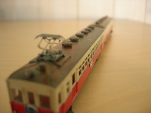Das Modell habe ich aus mehreren Fahrzeugen der Tomytec Train Collection Nr. 4 gebastellt. Da die Fensterzahl (Abteil) nicht stimmte habe ich ein Gepäckabteil herausgetrennt sowie ein neues Fensterabteil von einem anderen Modell wieder eingesetzt. Das Modell wurde neu lackiert. Der starre Stromabnehmer habe ich durch einen von Tomix ersetzt. Die Zugschilder habe ich am Computer erstellt.Die Wagennummern sind Nassschiebebilder von der Firma Microscale. Das Dach habe ich wie beim Original mit Rost versehen. Leider fehlt noch die Motorisierung durch ein Tomytec TM Fahrgestell.