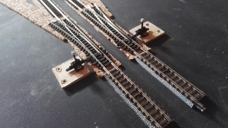 Vor einigen Wochen habe ich die ersten Flexgleise von Peco (Code 80) auf den Modulen verlegt. Heute kamen die ersten manuellen "Weichenantriebe" vom amerikanischen Hersteller Caboose Industries* an die Weichen ran. Der Einbau war etwas knifflig, da die Bohrungen an der Weichenschwelle und des Antriebfußes aufgeweitet und die Höhe angepasst werden musste. Auch das Ausrichten war fieselig. Aber nach dem ersten Einbau funktionierte die Weiche tadellos. Für die Sichtbarkeit der Weichenstellhebel wurden die Köpfe angemalt.