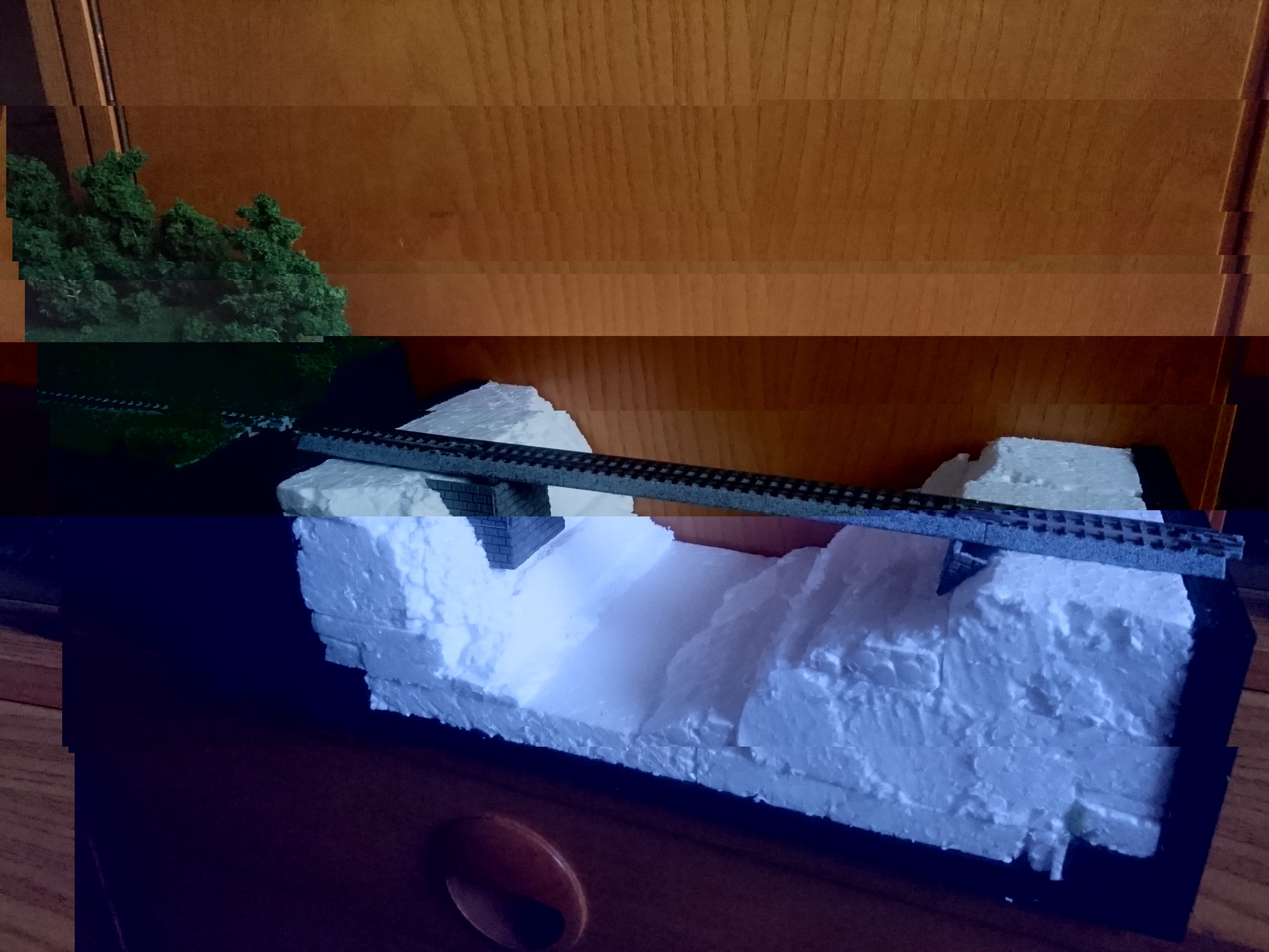 Die 2 Lagermauern entstanden aus Resten aus der Bastelkiste-nun muss die Brücke her sowie mehr Gleise