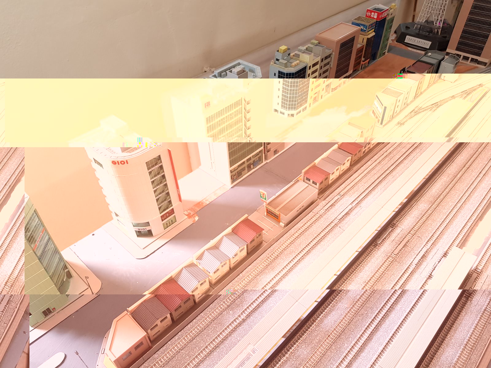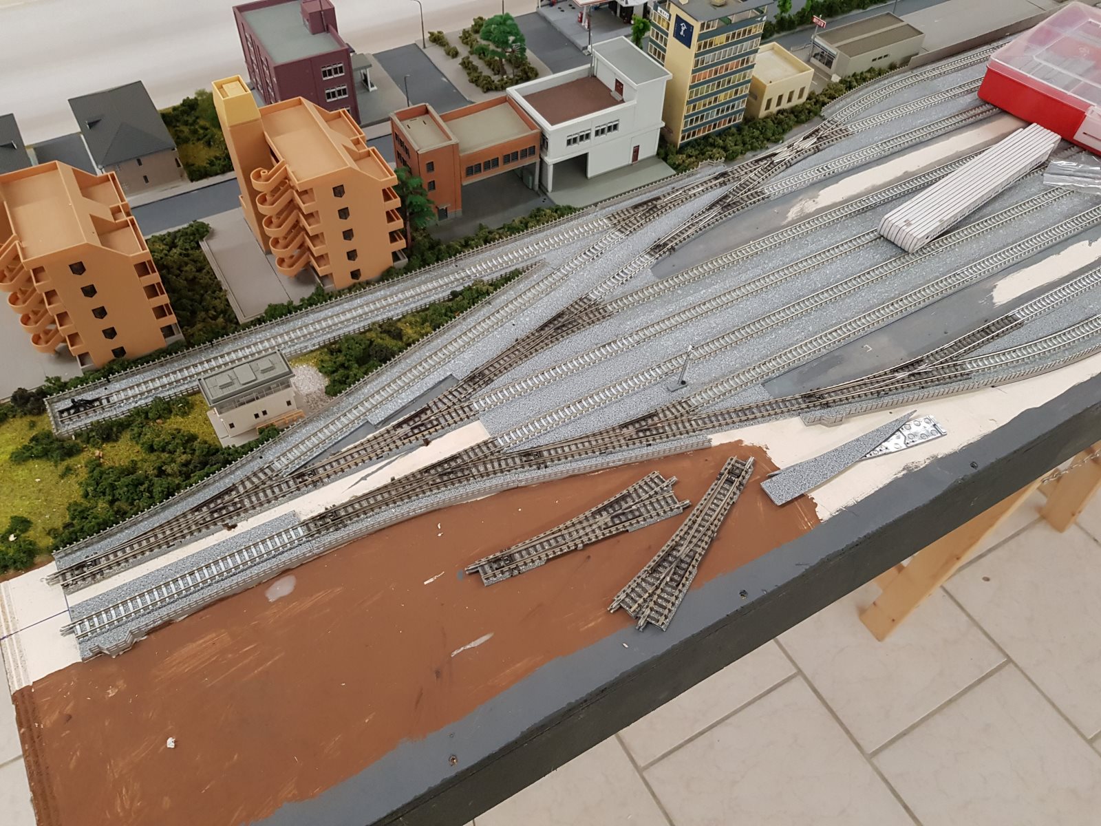 am Bahnhof selber habe ich nun die Gleiszwischenräume wieder gefüllt. Dafür bekam die Stadtzeile einen Umbau. Durch das abreißen des 50er Stadtmoduls hatte ich jetzt wieder die 3er-shops von Tomix frei, also habe ich die gleich hergenommen um die ganzen Shops am Bahnhofs weiter zu führen. Gegenüber wurde der Hochhausblock auch erweitert (gut jetzt fehlen noch 2 Kato Häuser die ordere ich aber die Tage nach). Der Sky Tree bekommt jetzt einen Fest Platz am ende der Bahnhofsstraße. Die noch freien Ecken auf der anderen Bahnhofsseite werden mit Shops und Wohnhäuser bebaut. Die Tage bastel ich wieder Gehwege aus Trittschalldämmung und dann sollte sich das Straßenbild schon verbessert haben.