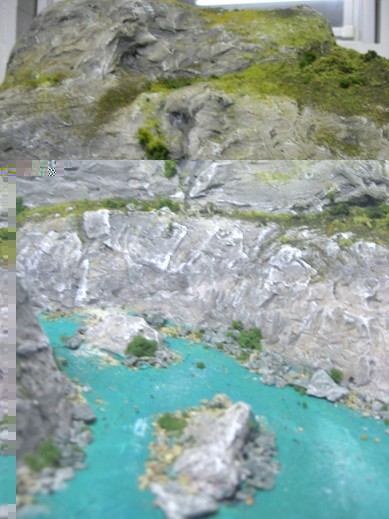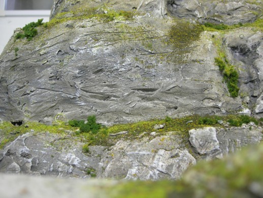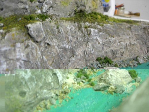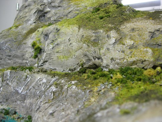 so hier nun das fast fertige Beispiel von den Styropor Gips Felsen. Begrünt habe ich mit Noch Fasern, Heki und Woodland Scenics Material, Bäume fehlen noch und der Fluss muss noch ausgegossen werden.