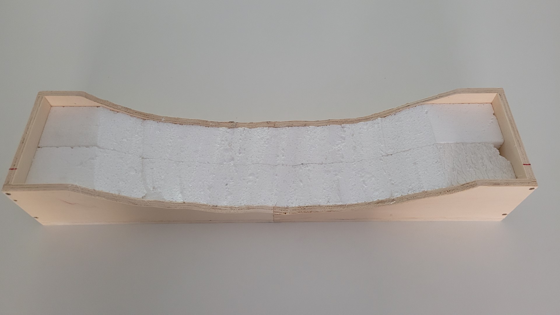 Dann schnitt ich eine Böschungslinie ins Holz. Den Hohlraum kleidete ich mit Styropor aus. Die Überhänge schnitt ich mit dem Heissdraht der Holzlinie folgend weg. Um das Durchsickern des Resin zu unterbinden zog ich eine Schicht Folie ein.