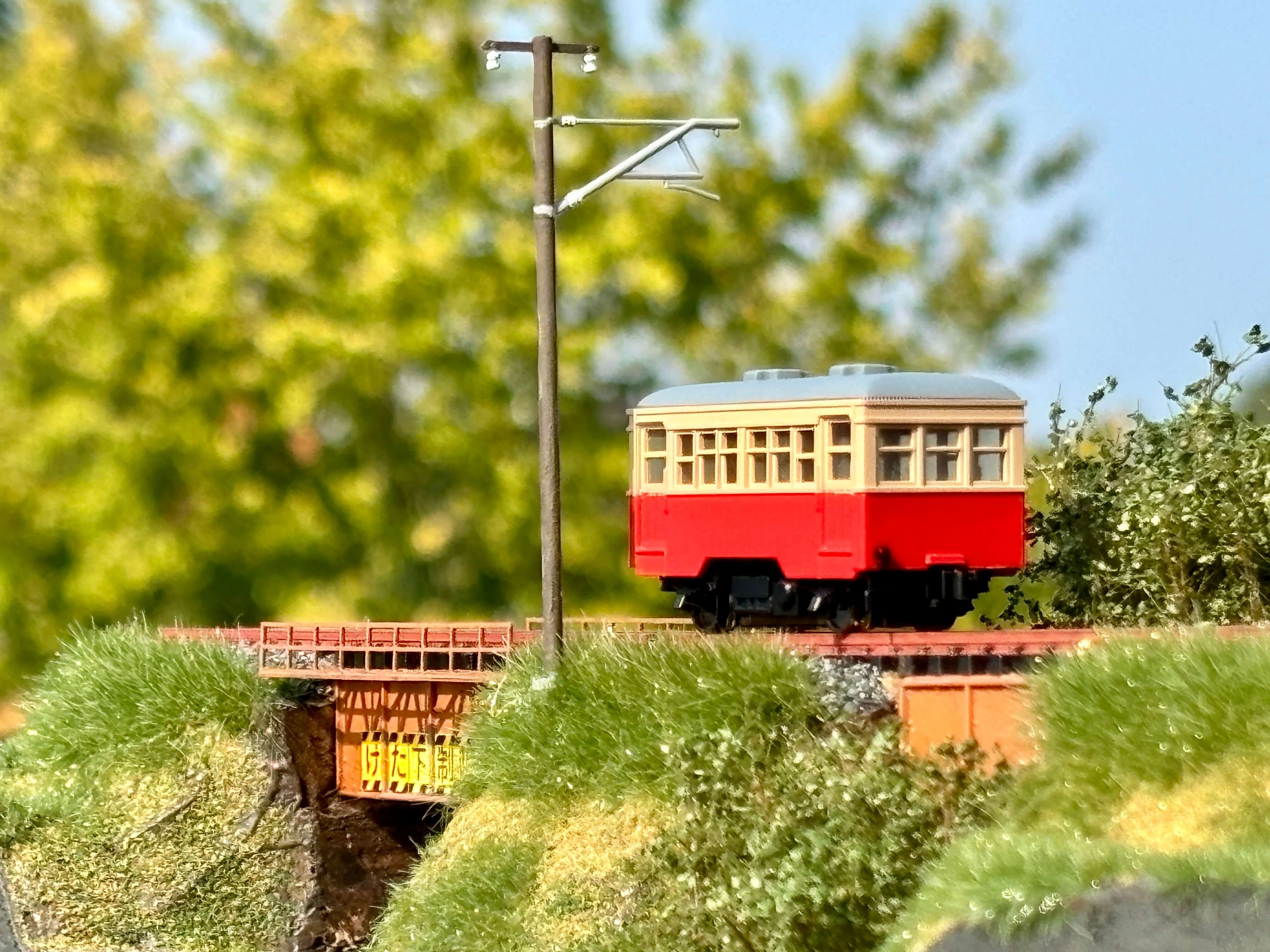 Das erste Modul ist eine vielgesehene Situation in Japan: Bahnstrecken führen über die kleinsten Landschaftslücken mit Hilfe von Blechträgerkonstruktionen. Mir kommt es so vor, als würde die Bahnstrecke über der Landschaft trohnen und still und schnurgerade die Stationen miteinander verbinden.