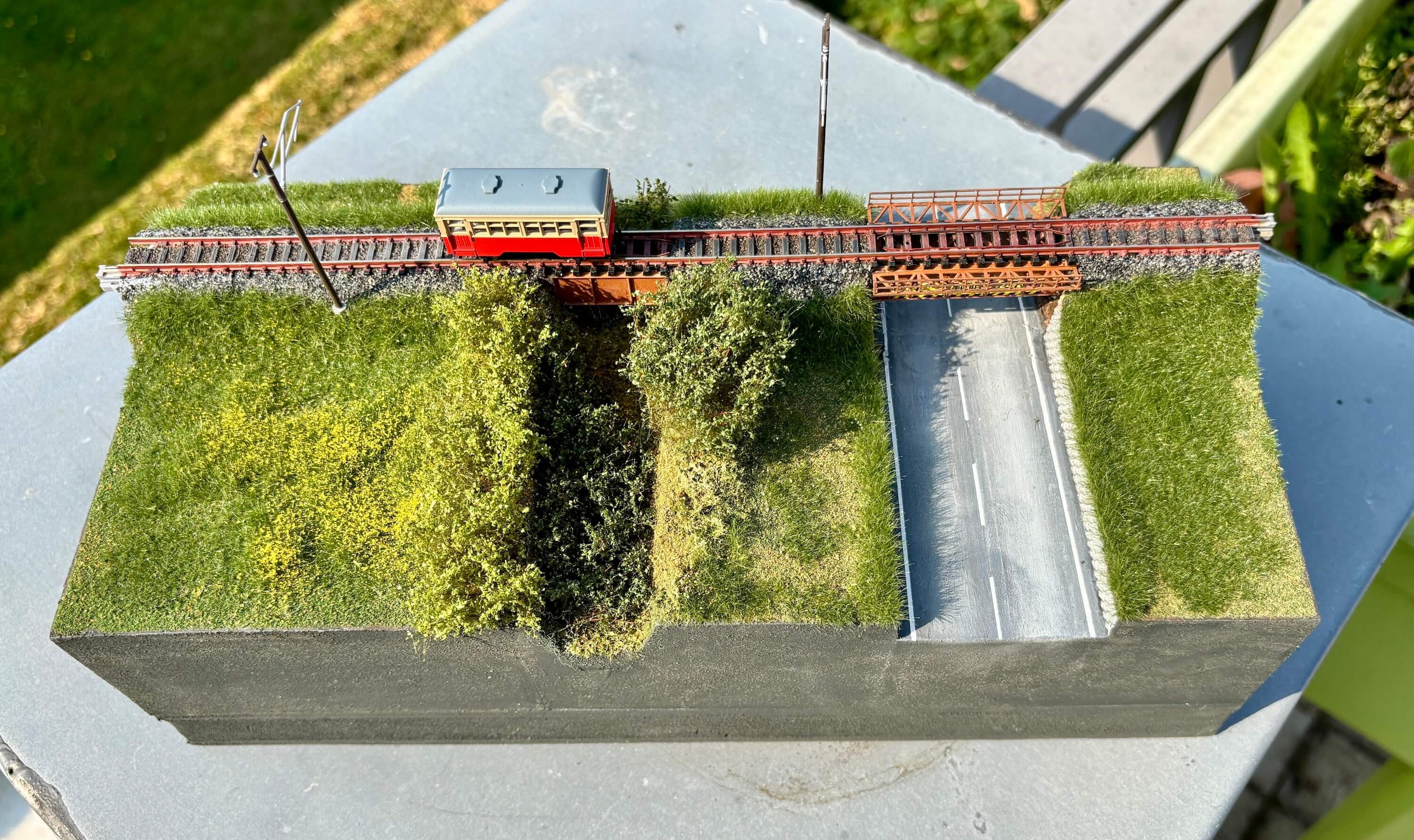 PS: Mir fallen gerade noch zwei Dinge auf, die ich nacharbeiten möchte. Die Oberleitungsmasten könnten besser aus Holz sein und ggf. seitlich abgestützt werden.