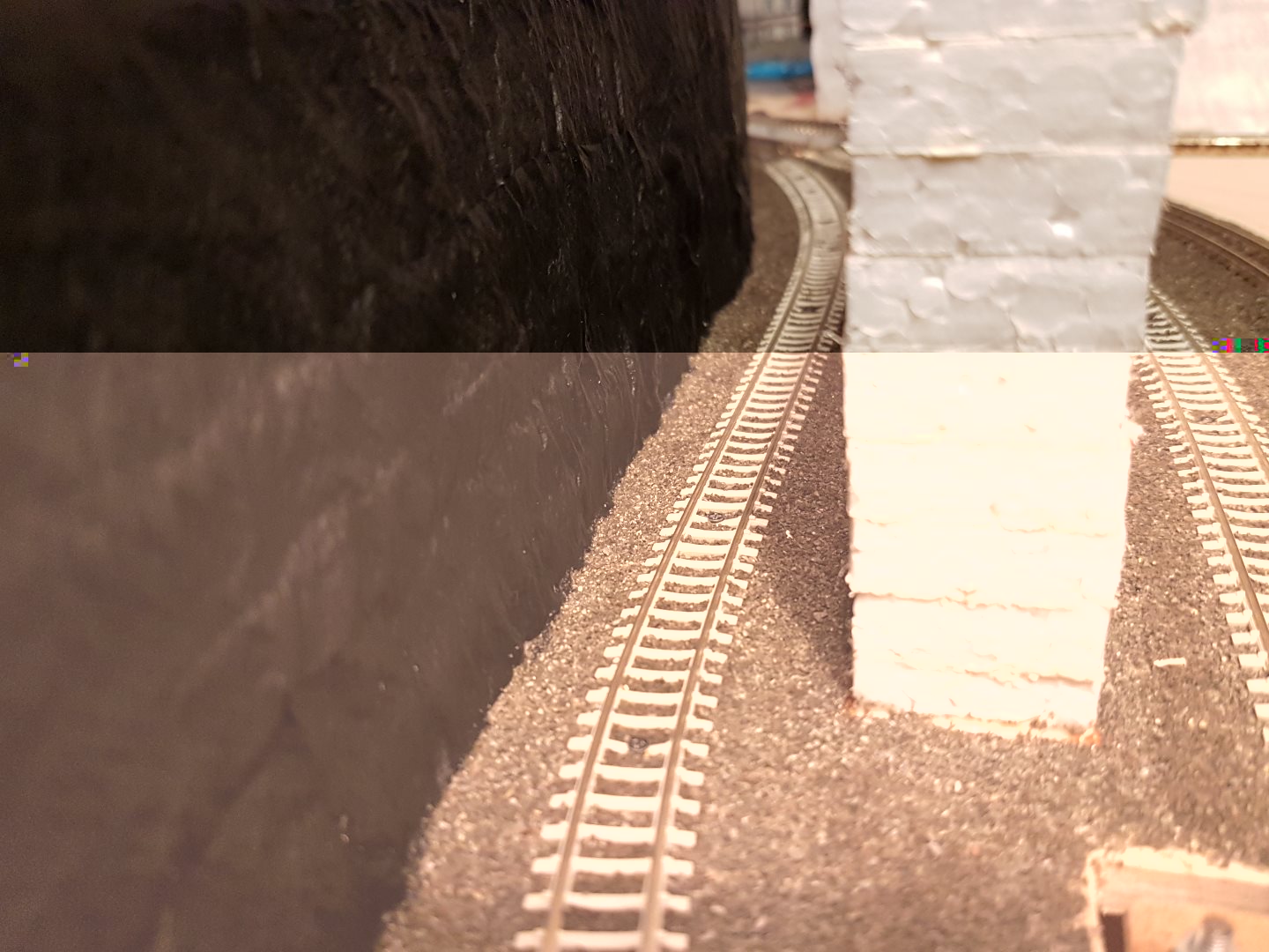 Beim Wendel Modul zum Schattenbahnhof habe ich mich für eine fixe Überplattung entschieden. Ich verwende eine stärkere, ich glaube, XPS Platte. Zuvor aber mache ich das Innenleben etwas adretter. Die Hauptstreckenführung wird eingeschottert, aber ohne Oberleitung ausgeführt. Die Tunnelwände sind höher als realistisch, aber dafür kann man bei Bedarf hineingreifen.