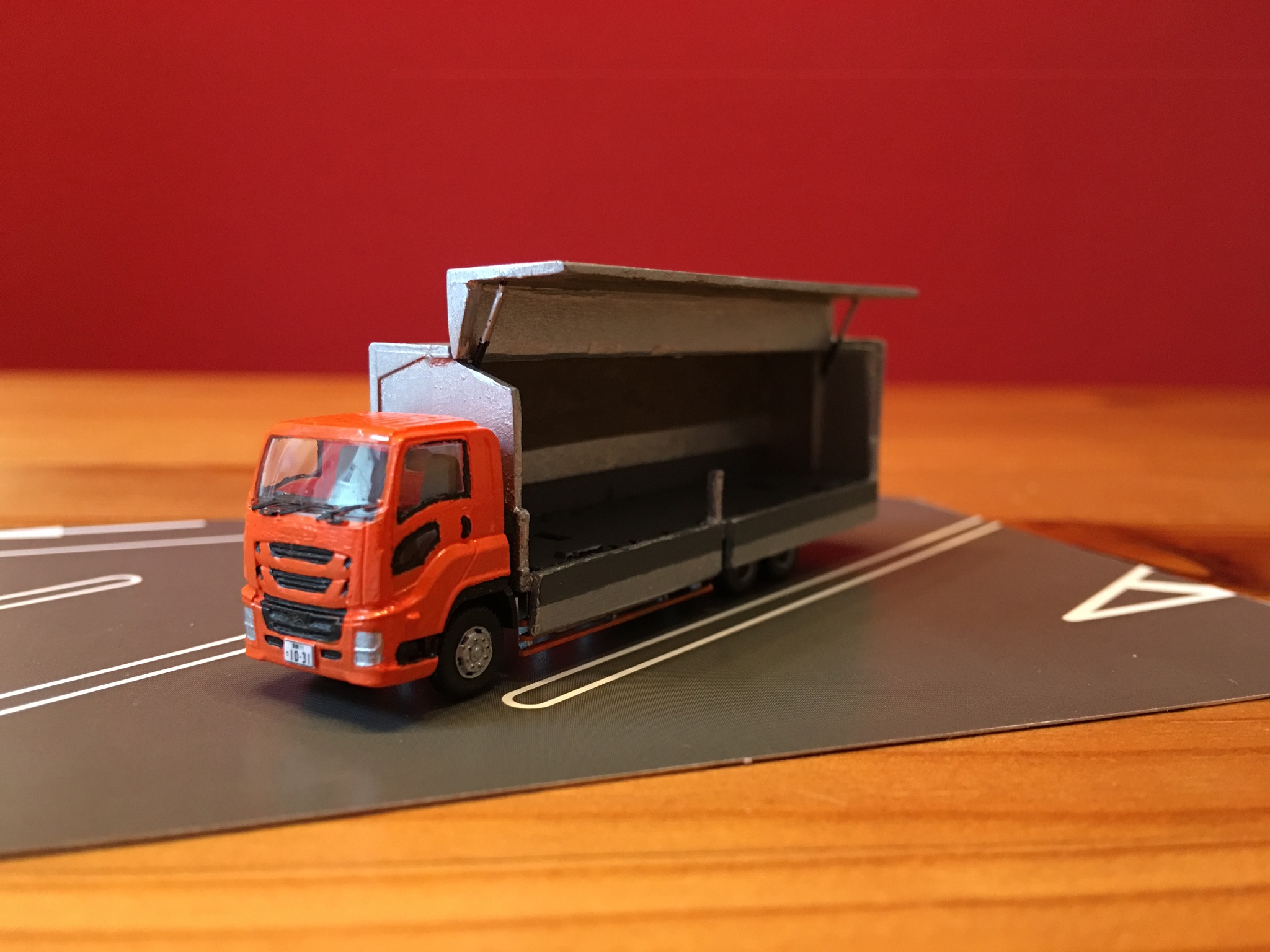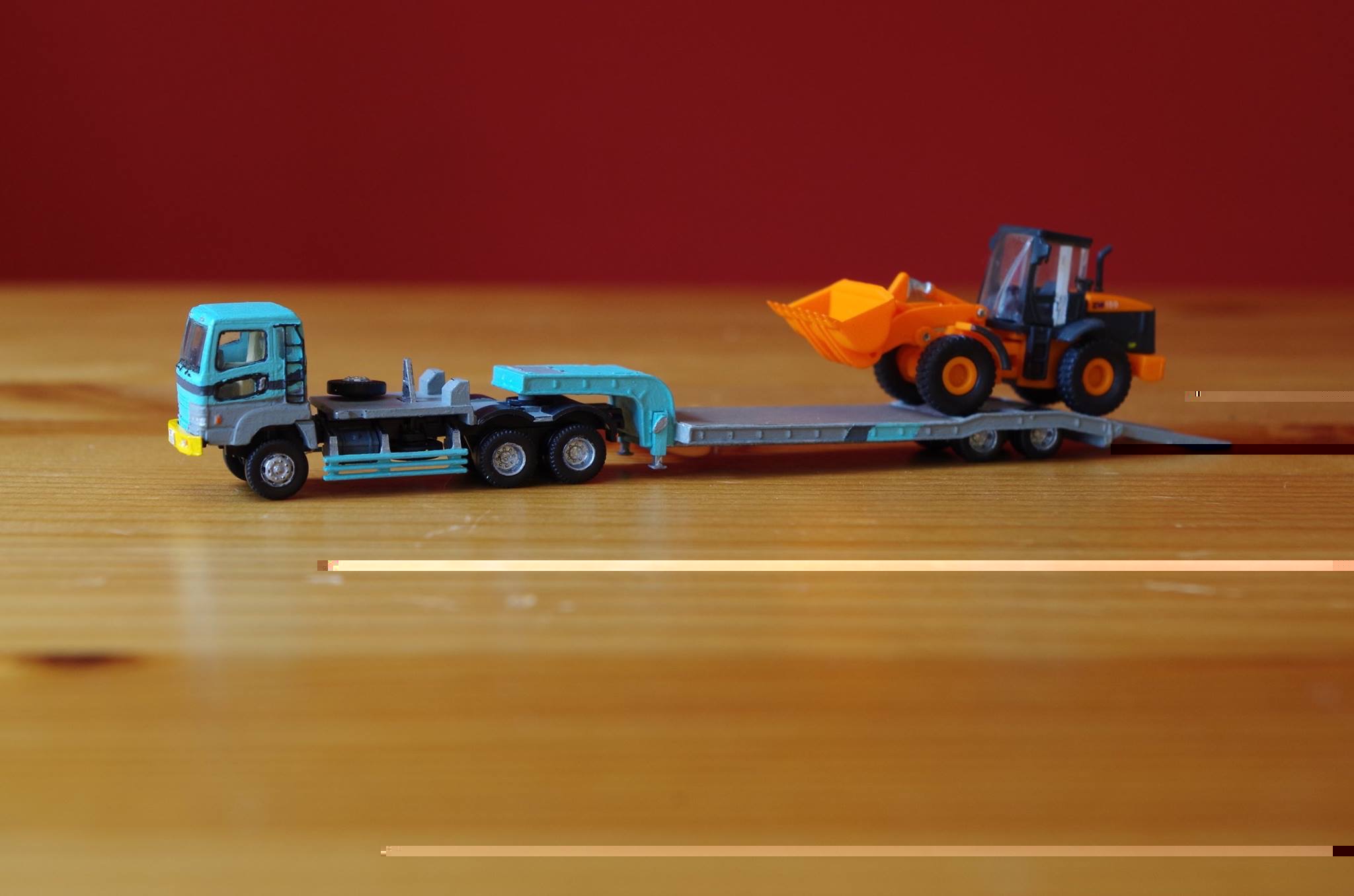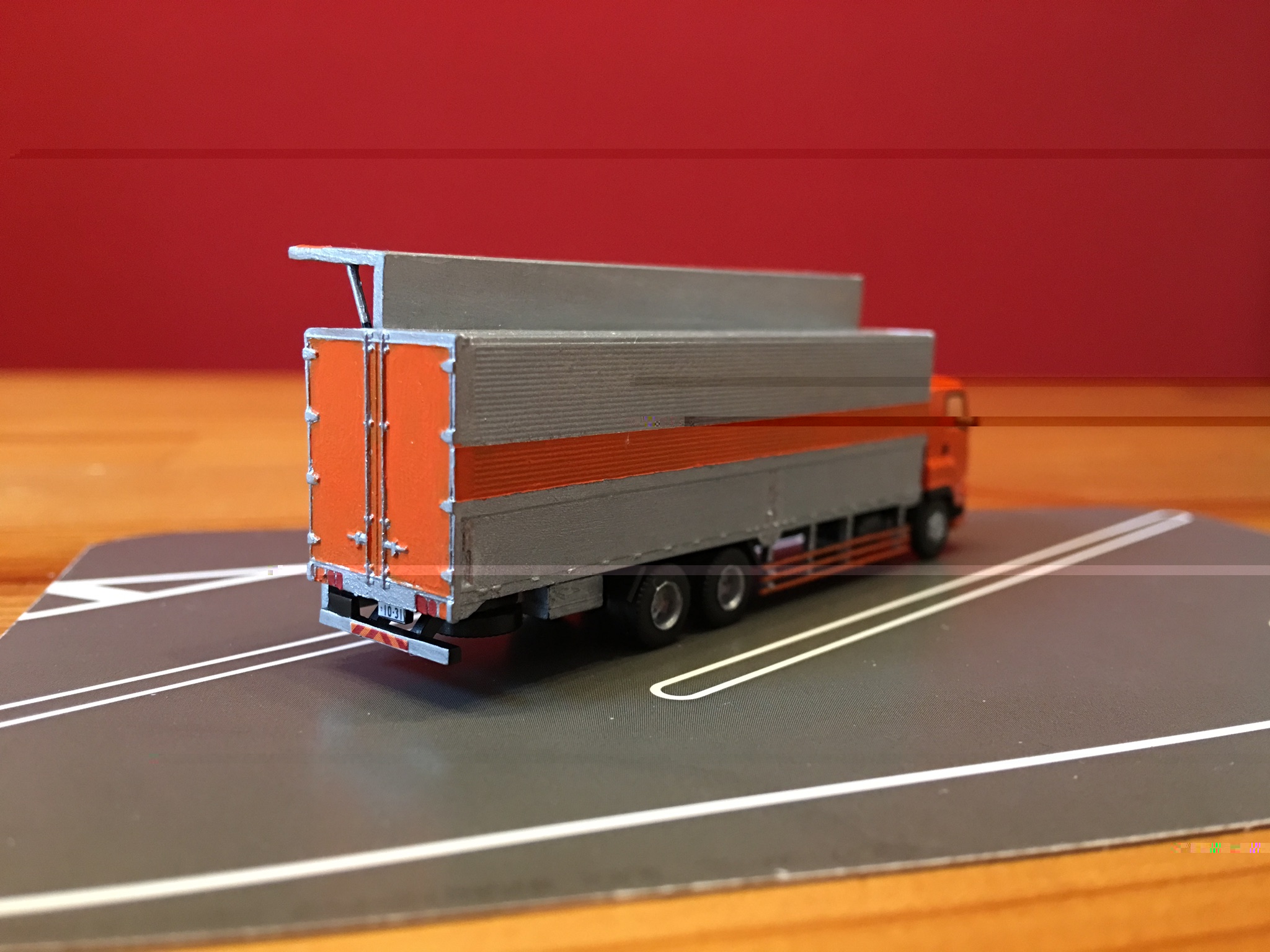 Schon bei der letzten Trailer Collection habe ich mich im Lackieren eines Tiefladers versucht, nur ein echter Umbau stand mir noch bevor. Mit der letzten Truck-Collection schneite ein Modell eines Iuzu-Giga ins Haus. Interessant fand ich dabei die Art und Weise, wie die Beladung des LKW erfolgen kann. So etwas wollte ich auch nachbauen. Also griff ich zum Skalpell und schnitt den Aufbau kurzerhand auf. Beim Lackieren des Modells profitierte ich von der fast zufälligen Entdeckung, dass Nagellackentferner mit Aceton sich super zum Vorbereiten für das Lackieren eignet, da er den Kunsstoff leicht anlöst und damit aufrauht (funktioniert nicht bei allen Kunststoffen, manche werden dadurch richtig, richtig glatt und glänzend). Mit dem Ergebnis der Lackierung bin ich im Großen und Ganzen zufrieden.