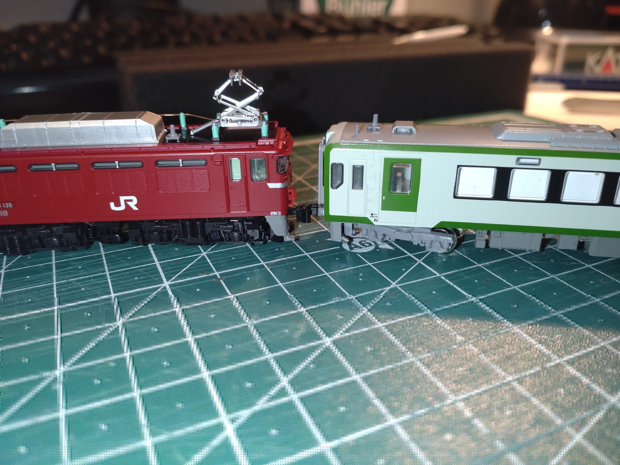 Heute kamen die Ersatzteile an. Die originalen Stromabnehmer auf dem MicroAce-Gehäuse der ED79-50 waren leider mit einem sehr dünnflüssigen Kleber verklebt und aufhebeln war keine Option. Mittels eines 0,5mm Bohrer mussten die Füße der Paletten von Innen heraus aufgebohrt werden. Dadurch fielen dann die alten MA-Stromabnehmer heraus. Nächster Schritt war das Aufbohren mit einem 0,7mm Bohrer für die Tomix-Stromabnehmer. Dadurch sitzen die Tomix-Stromabnehmer sehr stramm und fallen nicht heraus. Die Isolatoren müssen noch farblich nachbehandelt werden, was ich aber durch die späte Stunde nicht mehr erledigt habe. Unten der Unterschied zwischen neue und alte Stromabnehmer (links Tomix / rechts MicroAce)
