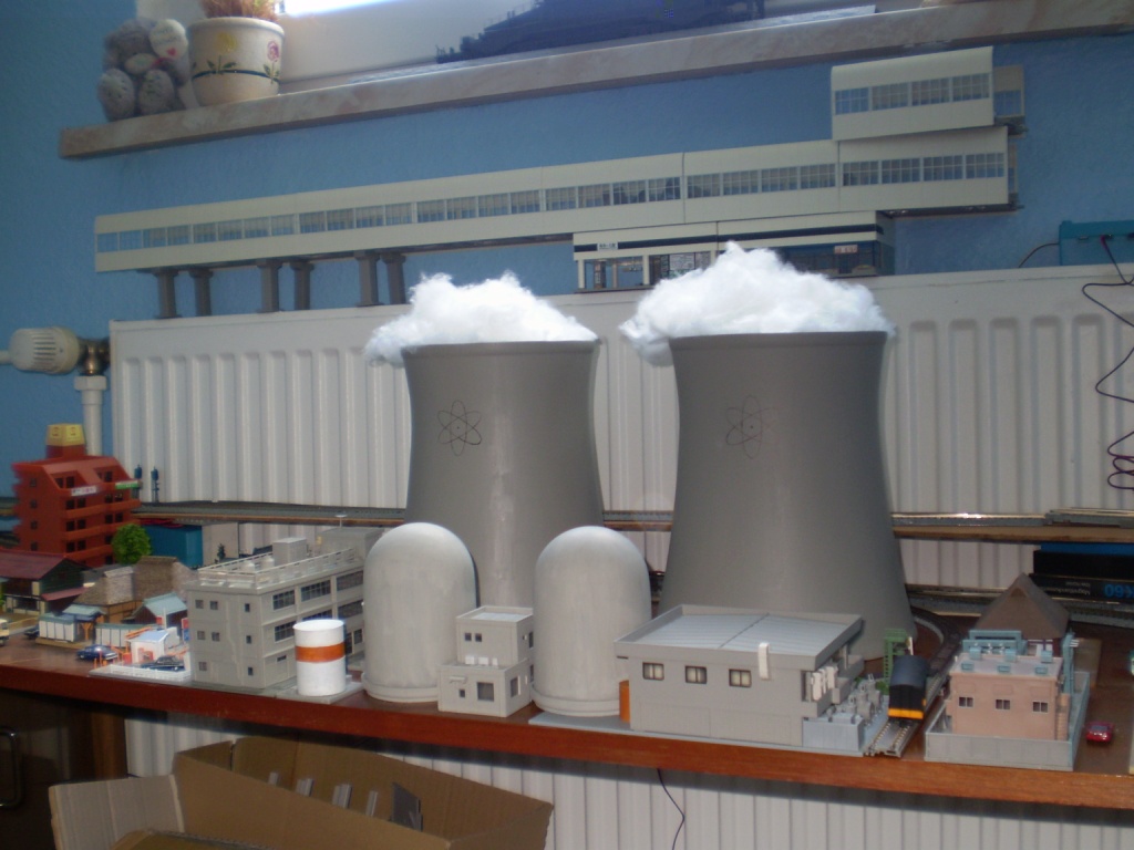 Mein absoluter Liebling. Bei Nacht leuchten die Kühlturmschwaden leuchtgrün! Demnächst kümmere ich mich um die Detailausstattung wie hohe Absperrzäune, detaillierte Bemalung und den Gleisanschluss.