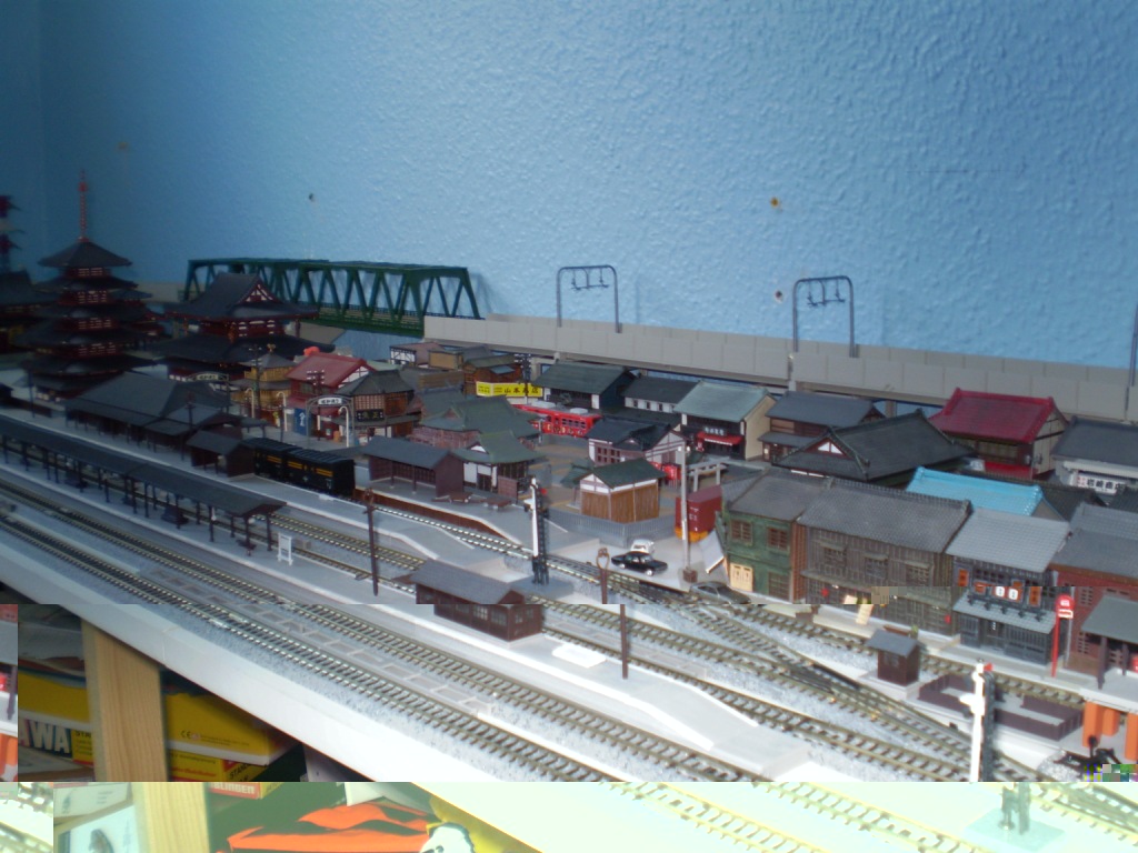 im Vordergrund ist der ländliche Bahnhof zu sehen. Rechts davon (nicht zu erkennen) schließt sich ein Bw für Dampf- und Dieselloks an inklusive Drehscheibe und Rundlokschuppen (9 Stände). Im Hintergrund ist eine Shinkansen-Schnellfahrstrecke und ein Teil des Tempelbezirks zu erkennen.