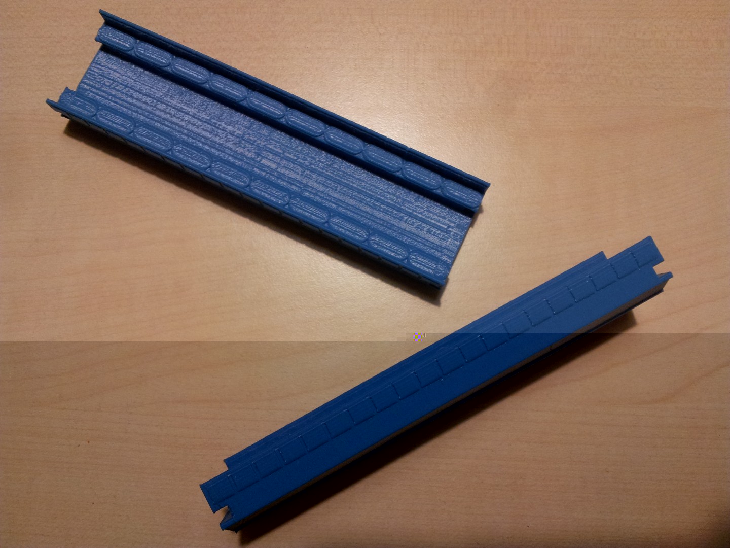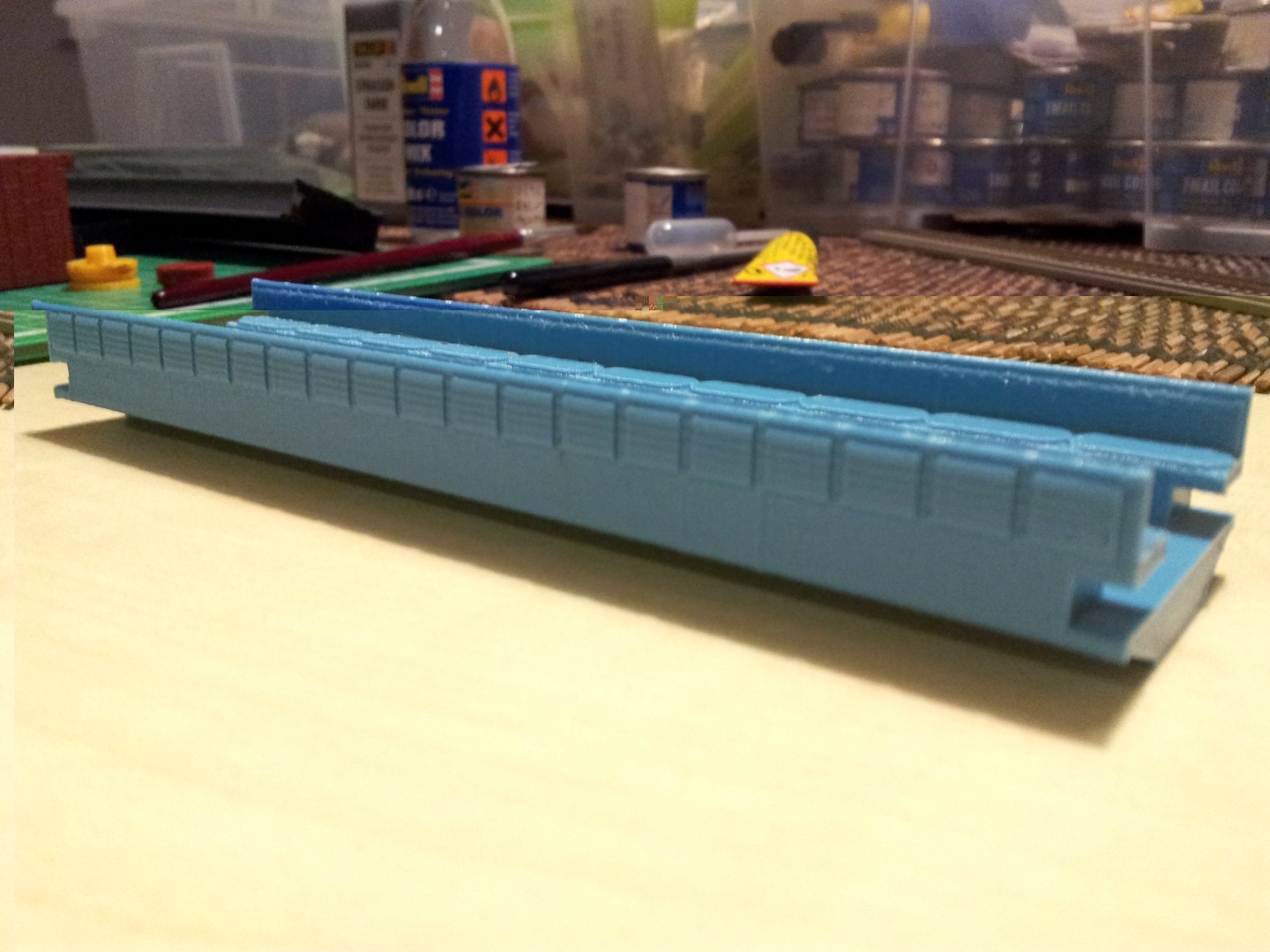 Ich drucke mit PLA. In der Wandstärke 1mm ist es ziemlich gleich verwindungssteif wie das gekaufte Tomix Produkt. Die Nachbearbeitung ist etwas anders als ABS oder PS (aus dem die Massenproduktion ist). PLA ist nicht so weich bei der Bearbeitung mit dem Skalpel und erscheint eher hart und spröde, nicht so weich und glatt. Farbe haftet wie bei jeden anderen Kunststoff.