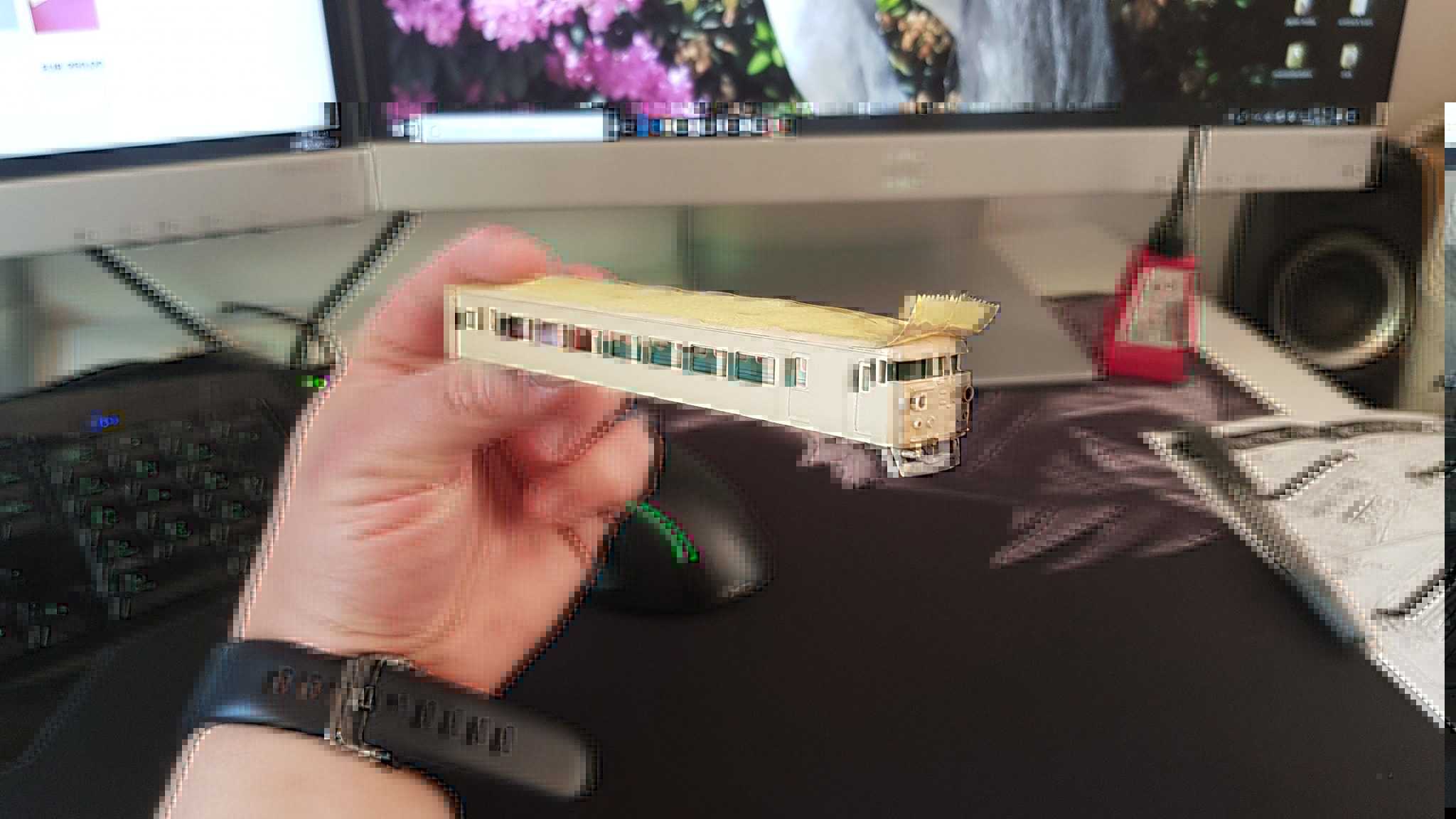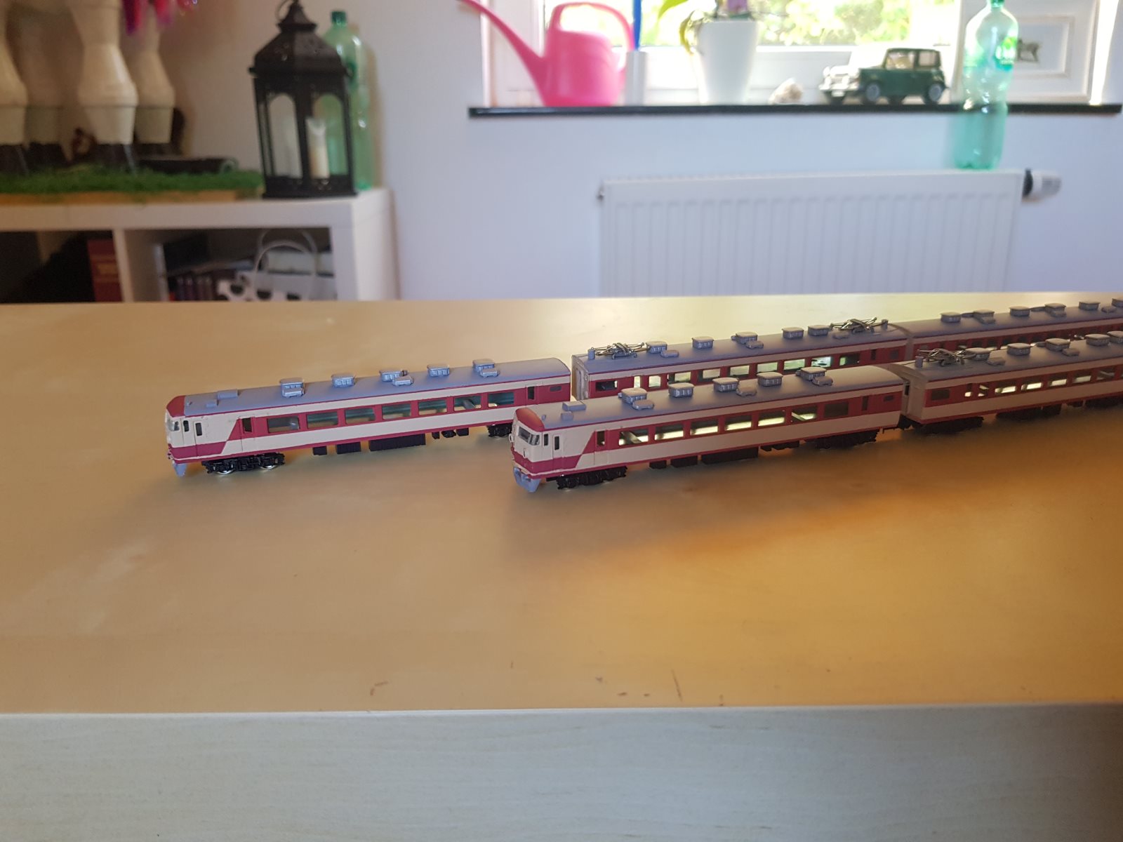 Wärenddessen habe ich die Bodengruppen auf der nach obenliegenden Seite mit dem Blassgrün lackiert (später auch die Gehäuse innen, wie früher typisch dieses Grün bei Japanischen Triebfahrzeugen