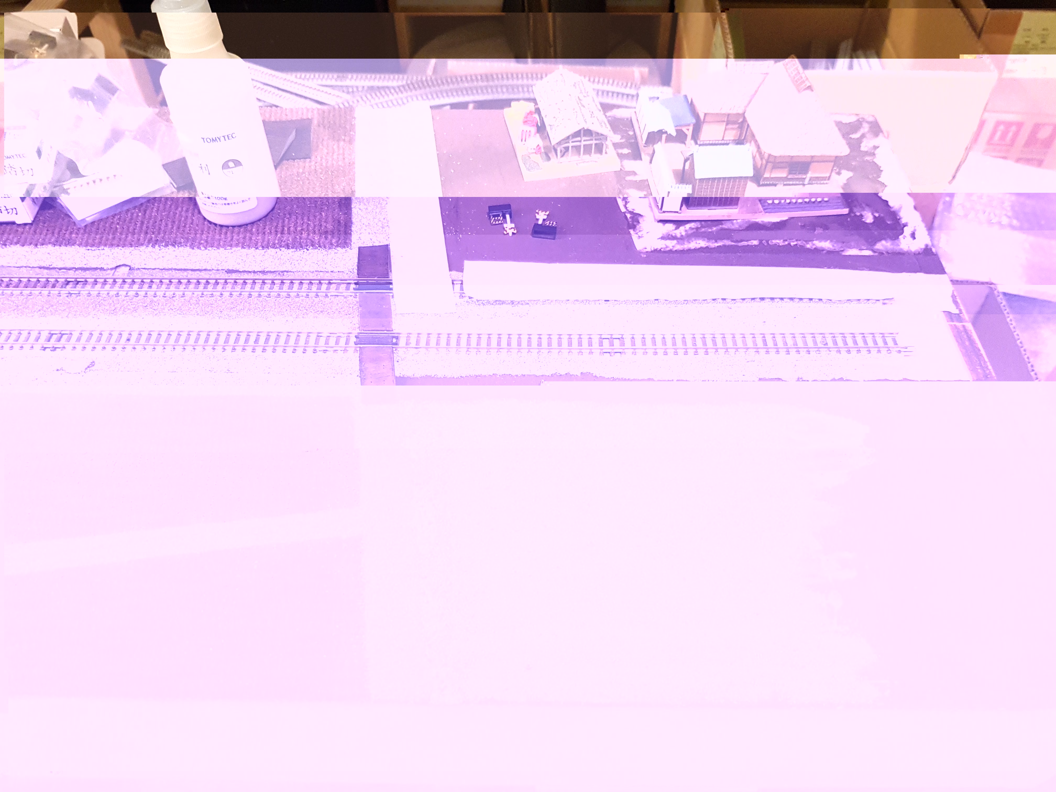 Da es so einen großen Radius nicht fertig von Tomix gibt, muss Flexgleis verlegt werden. Damit die Höhe des Tomix Gleis erreicht wird, lege ich für das PECO Gleis Kork auf. Die Überhöhung erreiche ich mit versetzten, dünneren Streifen.