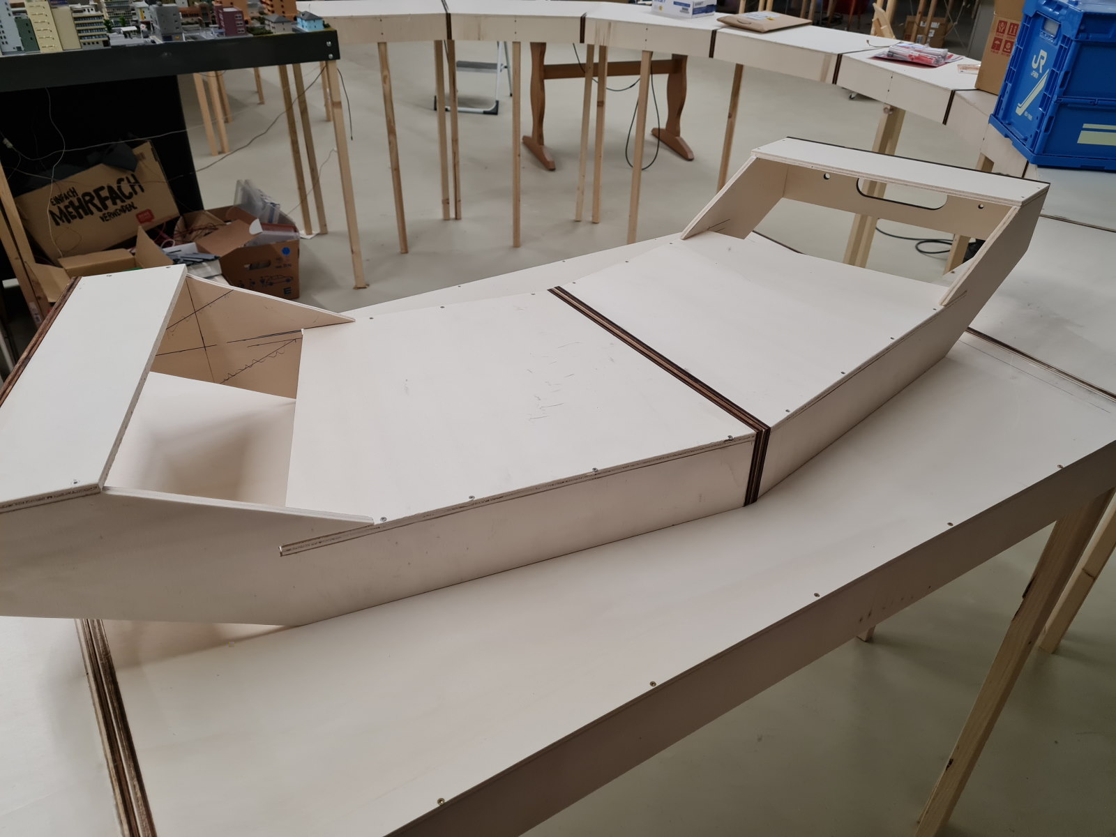 Wie geplant bekommt mein einen Radius von 1600 hin. Die versetzten Module lassen mich mit 10cm kürzeren Beinen beliebig erweitern.