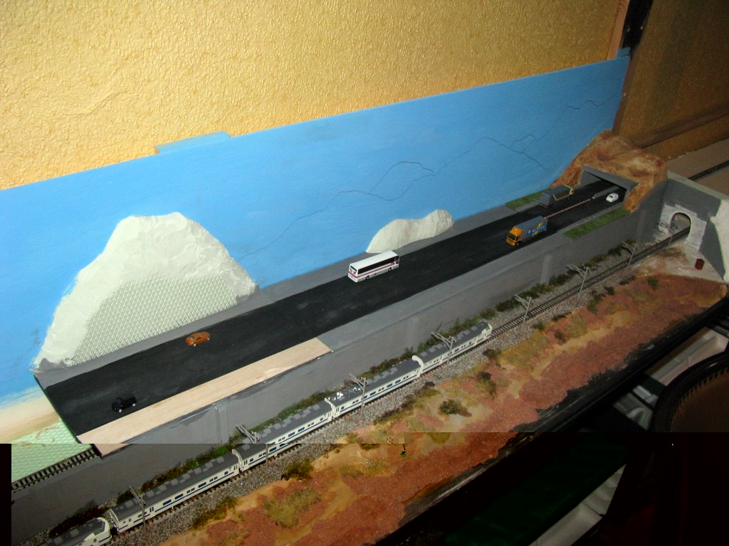 Ansonten bin ich grad am übergegen, wie ich die Rampe unter dem Berg realisiere. Einerseits würde ich gerne dünnes Sperrholz nehmen und das ganze dann in eine L-Form bringen. Auf der anderen Seite experimentiere ich mit Pappe, die mit Abtönfarbe getränkt wird. Die Pappe lässt sich dann besser in die Form bringen. Die Höhendifferenz beläuft sich auf rund 2 cm auf einer Länge von etwas mehr als 1,0m