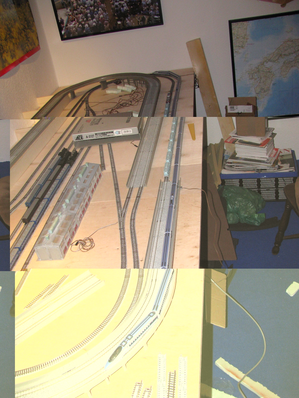 also ich muss auch gestehen das mir die erweiterte Sho Toshi Anlage zu star wäre. Wie wäre es, wenn du im Hintergrund eine ebene Höher (wie eben dein Hochbahnhof) eine schöne lange Paradestrecke, dezent geschwungen machst (mit Steilkante, wunderbar in den Greenmax Katalogen zu sehen :D ) - wäre mit den 610er und 541er Radien von Tomix wunderbar möglich. en rest würde ich dezent beibehalten, aber plausibler mit Landschaft verstecken (theorethisch kannst du unterhalbt der hinteren Ebene, im Berg getarnt sogar, die Strecke auch laufen lassen das du halt eine übereinandergelegte 8 hast. Die Vordere seite würde ch so gestalten das der Bahnhof vorne liebt, das BW selber bzw. die abstellanlagen nicht die komplette Mitte ausfüllen und ggf. die ein oder andere Strecke geschwungen gestaltest ;) ist auch mit dem Tomixgleis möglich.