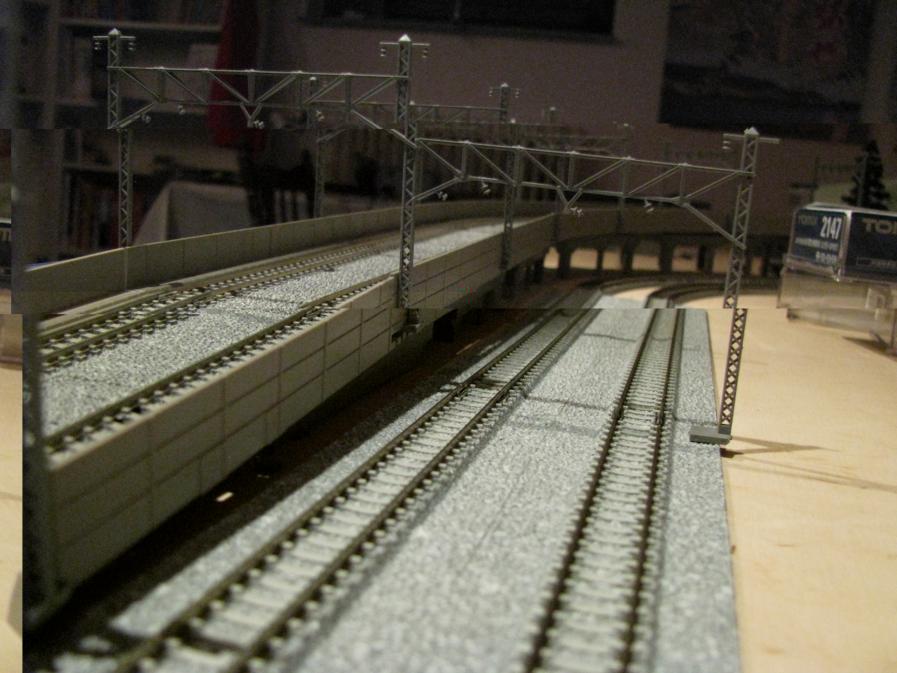 das Abschneiden bringt mich ja auch nicht weiter, da die Masten ja trotzdem das Raster haben. Woher ist es halt nicht so aufgefallen, da man das normale Gleis noch immer etwas drücken und schieben kann. Nun liegt alles fix und da rührt sich nicht mehr so viel. Aber das ist ja genau das, was ich wollte. Und bis auf diese eine Stelle passt das auch so.