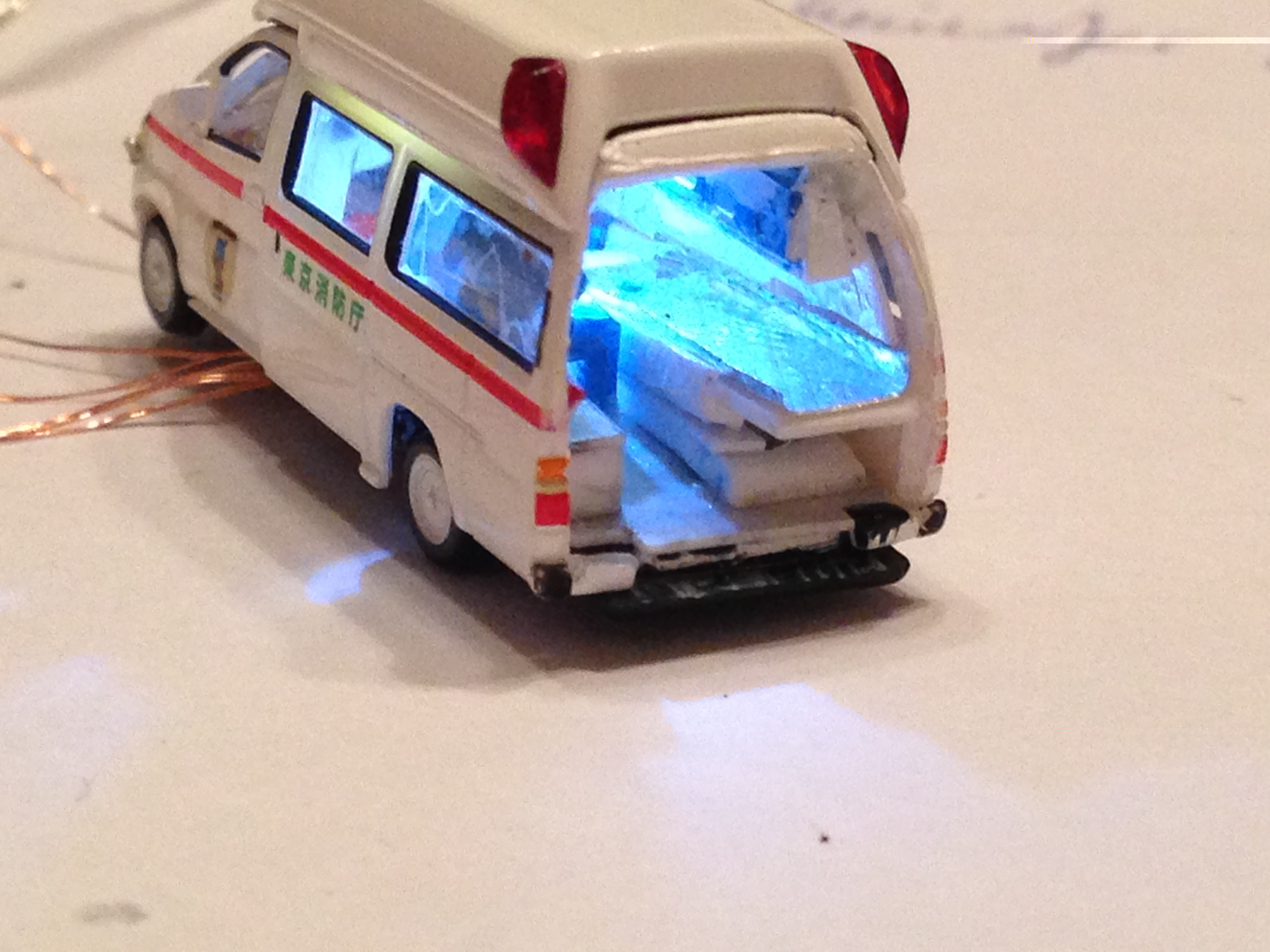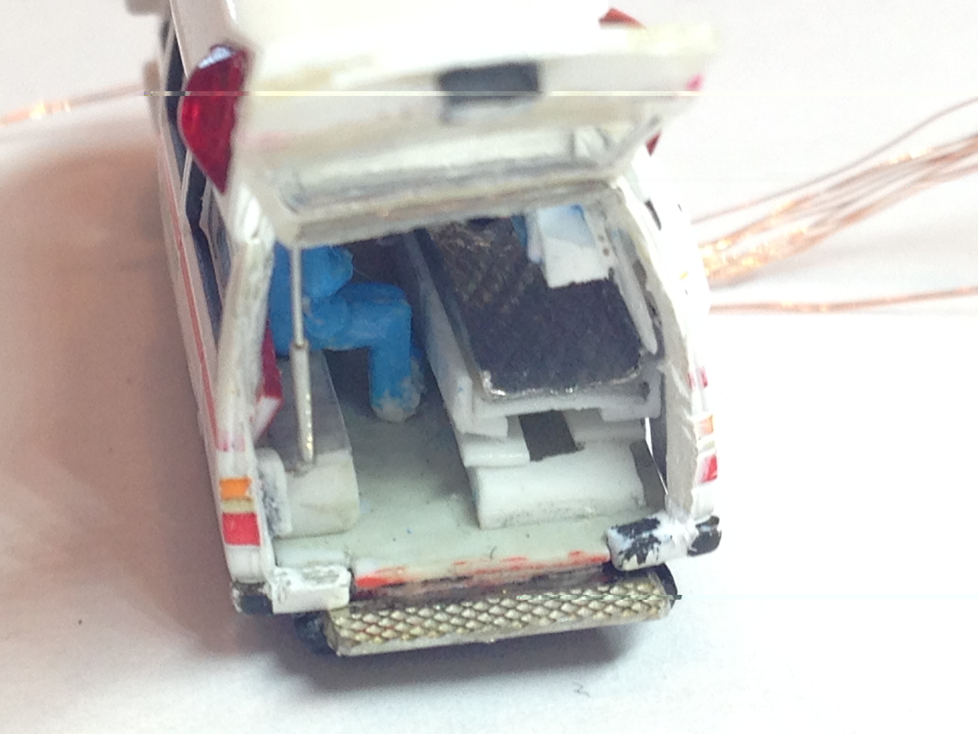 Bei dem rescue car lässt sich die Heckklappe öffnen und die Trage etwa auf 3/4 der Länge herausziehen. Soweit es ging habe ich die Inneneinrichtung Z.B. mit Sanitätern einschl. Fahrer und Beifahrer, Schränken, Sitzen, Tropf etc. nachgebildet. Sogar einen Stoßdämpfer (2 Kanülen mit unterschiedlichen Durchmessern) hat die Heckklappe.