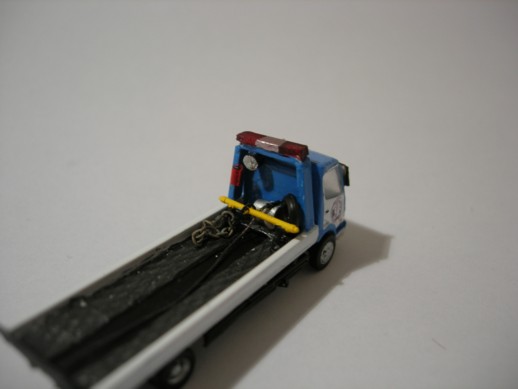 Das Modell endstand aus einer Bandai LKW Kabine, welche neu Handbemalt wurde. Der Aufbau ist ein Eigenbau aus Polystyrolplatten und Profilen sowie diverse Kleinteile aus der Bastelkiste. Seitenspiegel sind aus Draht. Der Rotlichtbalken ist aus einem Spritzgussrest gemacht. Self made Decals.