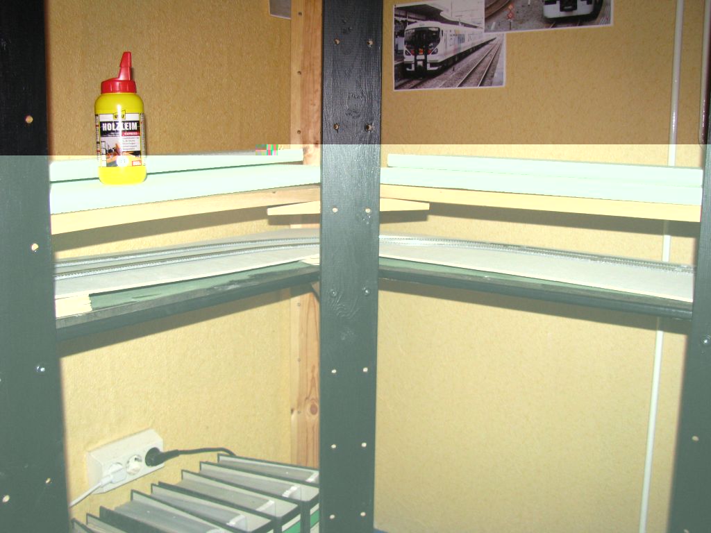 Ansonten bin ich grad am übergegen, wie ich die Rampe unter dem Berg realisiere. Einerseits würde ich gerne dünnes Sperrholz nehmen und das ganze dann in eine L-Form bringen. Auf der anderen Seite experimentiere ich mit Pappe, die mit Abtönfarbe getränkt wird. Die Pappe lässt sich dann besser in die Form bringen. Die Höhendifferenz beläuft sich auf rund 2 cm auf einer Länge von etwas mehr als 1,0m