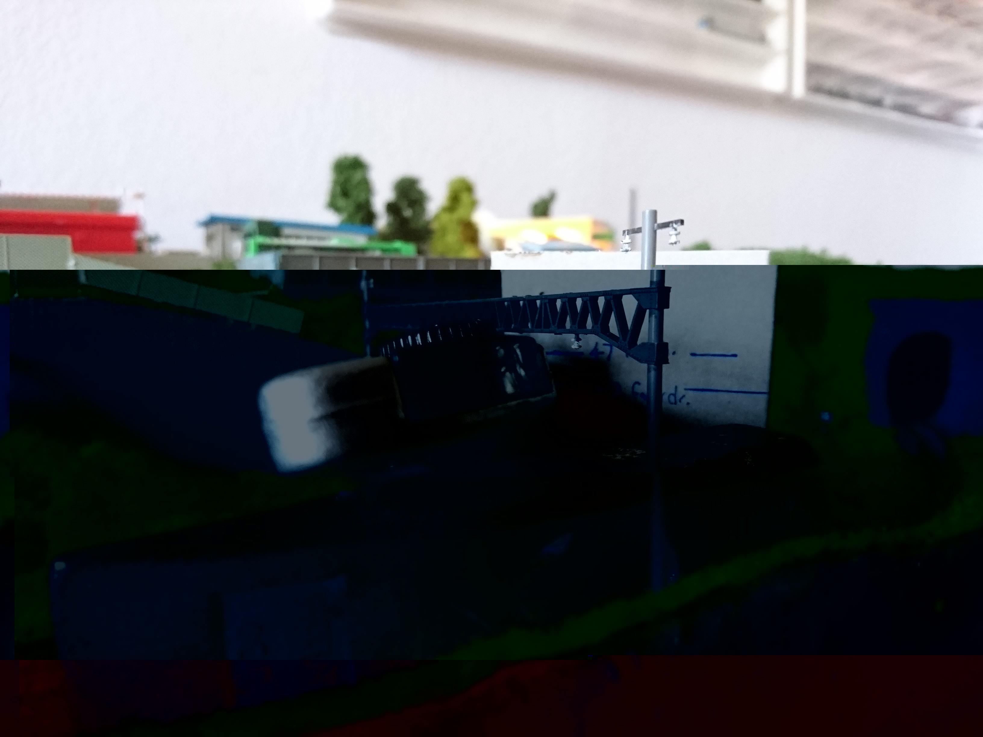 Oberleitung erschwert natürlich das Aufgleisen von Fahrzeugen. Auf vielen größeren Anlagen habe ich spezielle Gleise am Rand der Modelbahnanlage gesehen, auf denen nur aufgegleist wird. So ein Gleis kann man in eine Abstellanlage integrieren. Eine weitere Möglichkeit ist das Minitrix-Gleis 4974, dass man durch Unterfütterung auf Kato- oder Tomix-Höhe bringen kann. Dieses Gleis ist als unbeschrankter Bahnübergang getarnt und eignet sich auf der Strecke auch als Eingleiser für entgleiste Fahrzeuge. Das Gleis hat eine Länge von 100 mm.