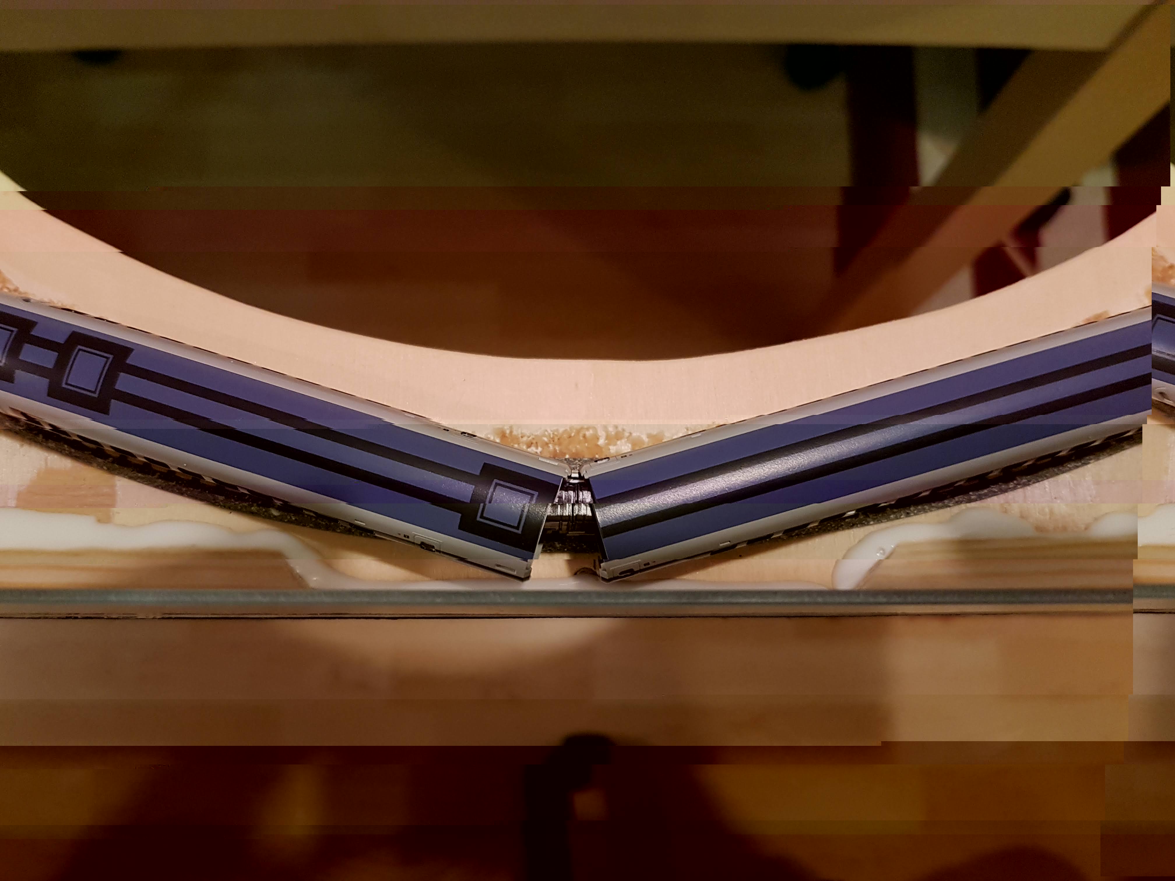 Joah, und dann bin ich draufgekommen das es nicht so Ideal ist wenn das V-Gleis direkt auf das Flex Gleis trifft. Also musste ich die wunderschöne Kurve etwas stutzen und verrücken und stückeln und jetzt paßts.