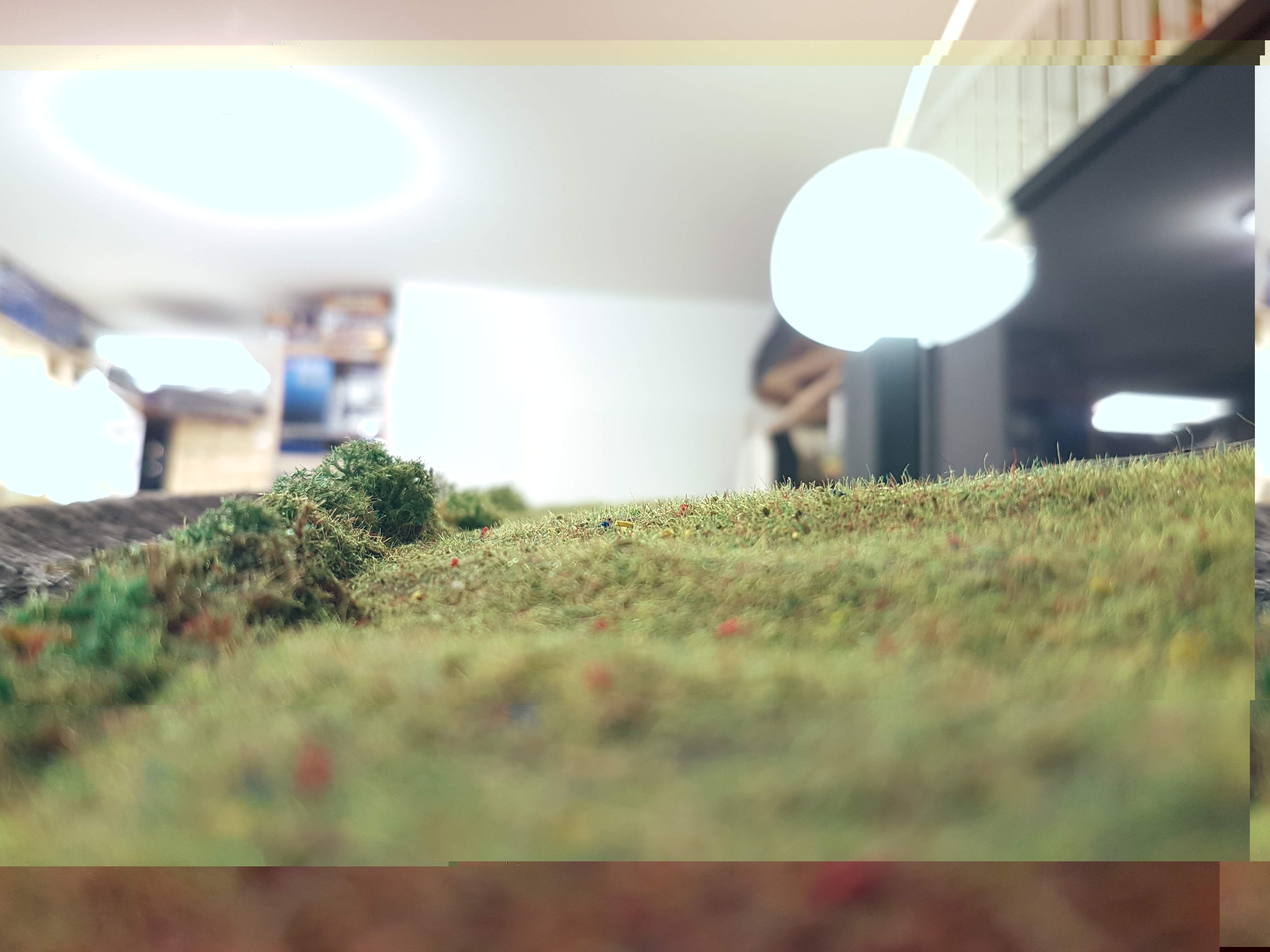 Das Landschafts Modul habe ich von meinem Bahlsen/Kaffee Experiment befreit, und bin auf gekaufte Felder ausgewichen. Zusätzlich zum von Anfang an geplanten Bahnübergang, habe ich einen weitern, kleinen, Bahnübergang eingebaut.