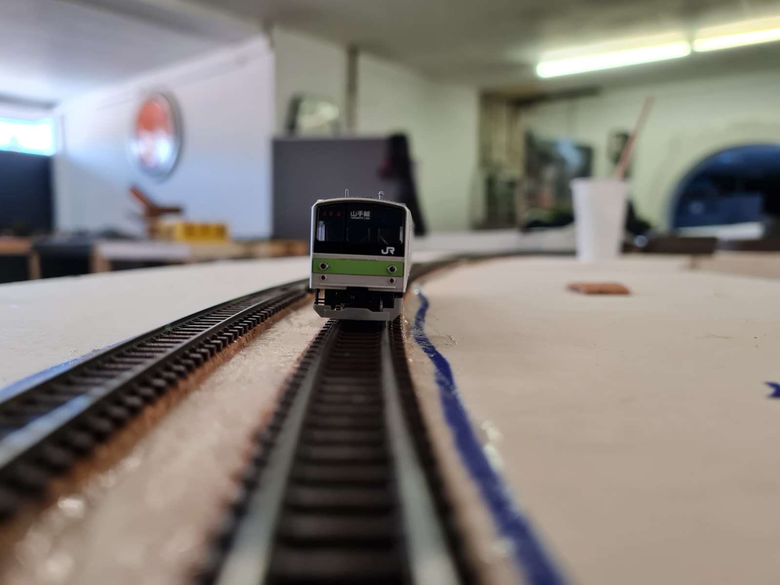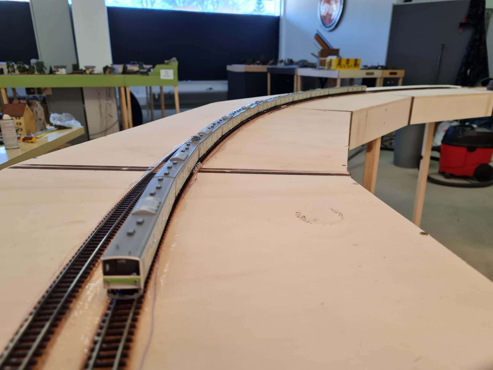 der Halbkreis ist schonmal geschafft :) ich warte im moment noch auf die restlichen Pecoweichen für den Bahnhof. Morgen will ich die fehlenden Schwellen ergänzen, OL Masten setzten und das schottern anfangen. Zur Probe durfte mal der 500er Shinkansen (müsste eigentlich in den heute erhalten Theard, der kam letzte Woche frisch an) sich in die Kurve legen obwohl er später dort nie fahren wird :roll: