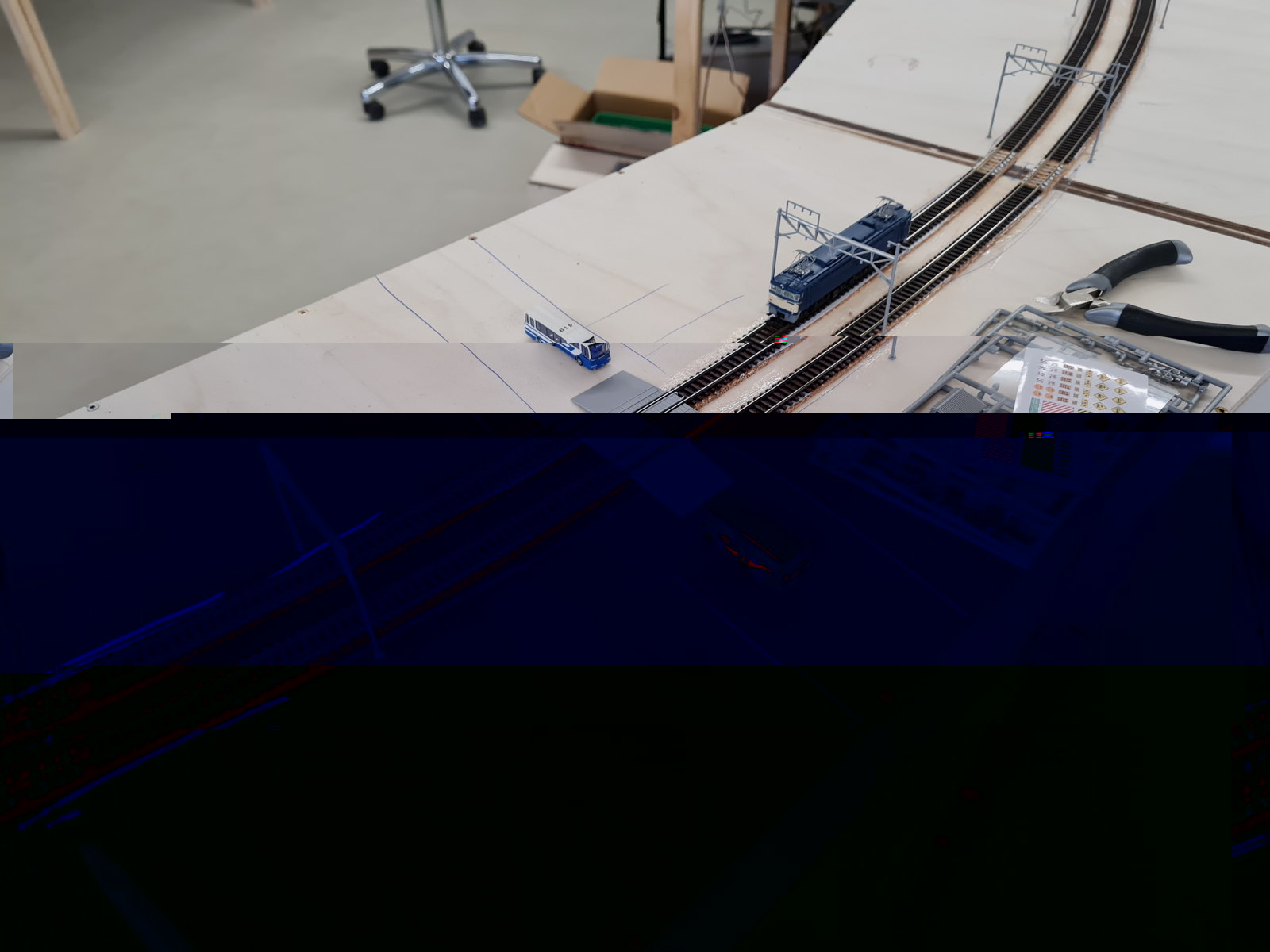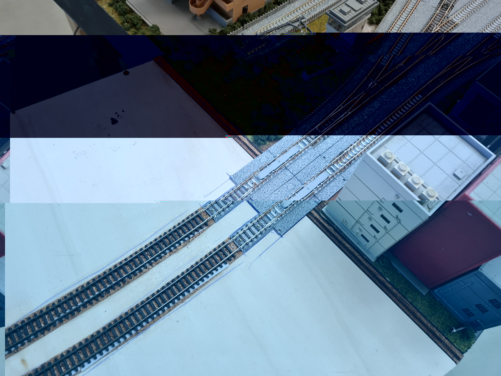 Die Kurvenüberhöhung habe ich mit Streifen aus einer 0,25mm Evergreeplatte gemacht.